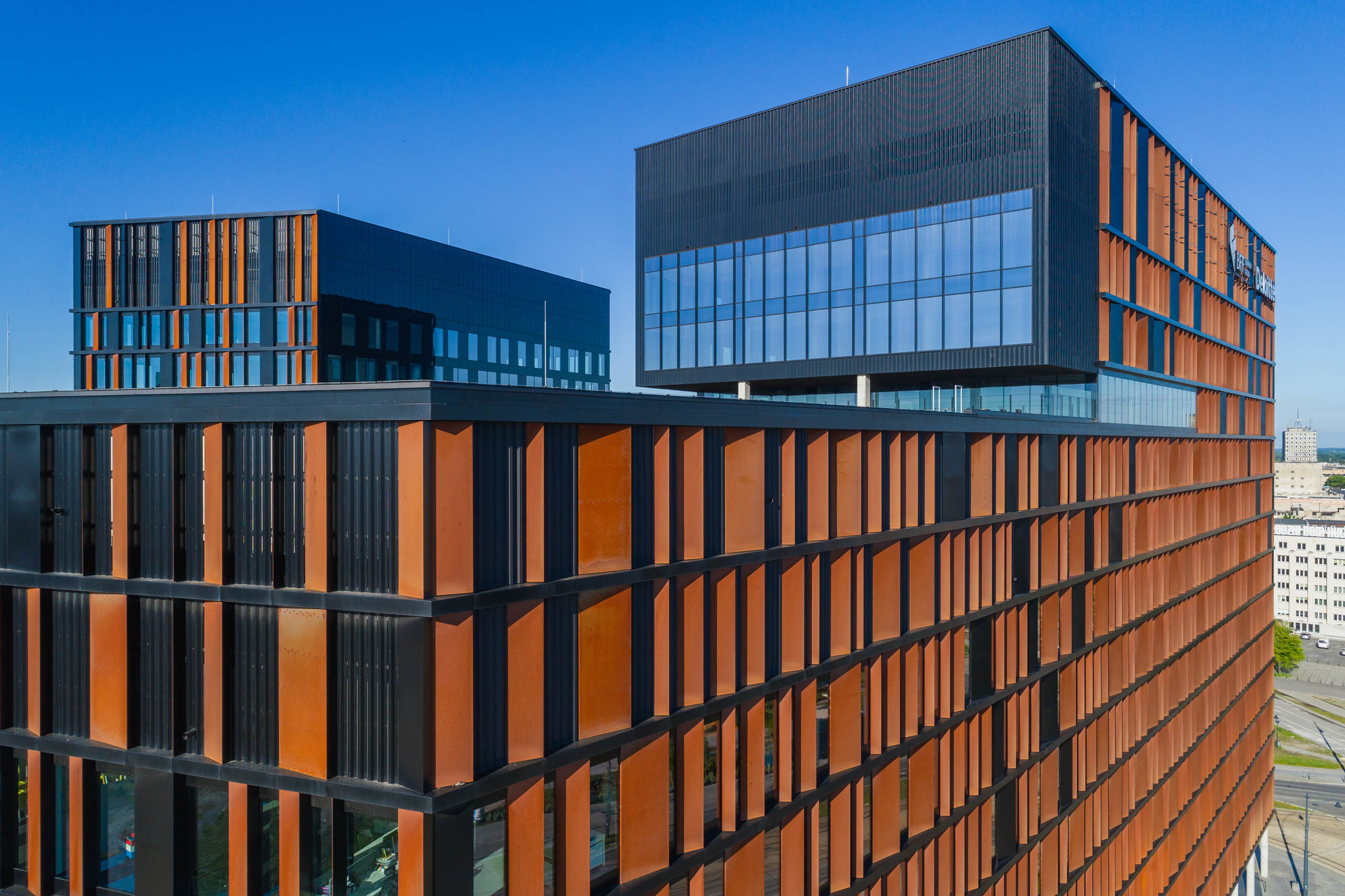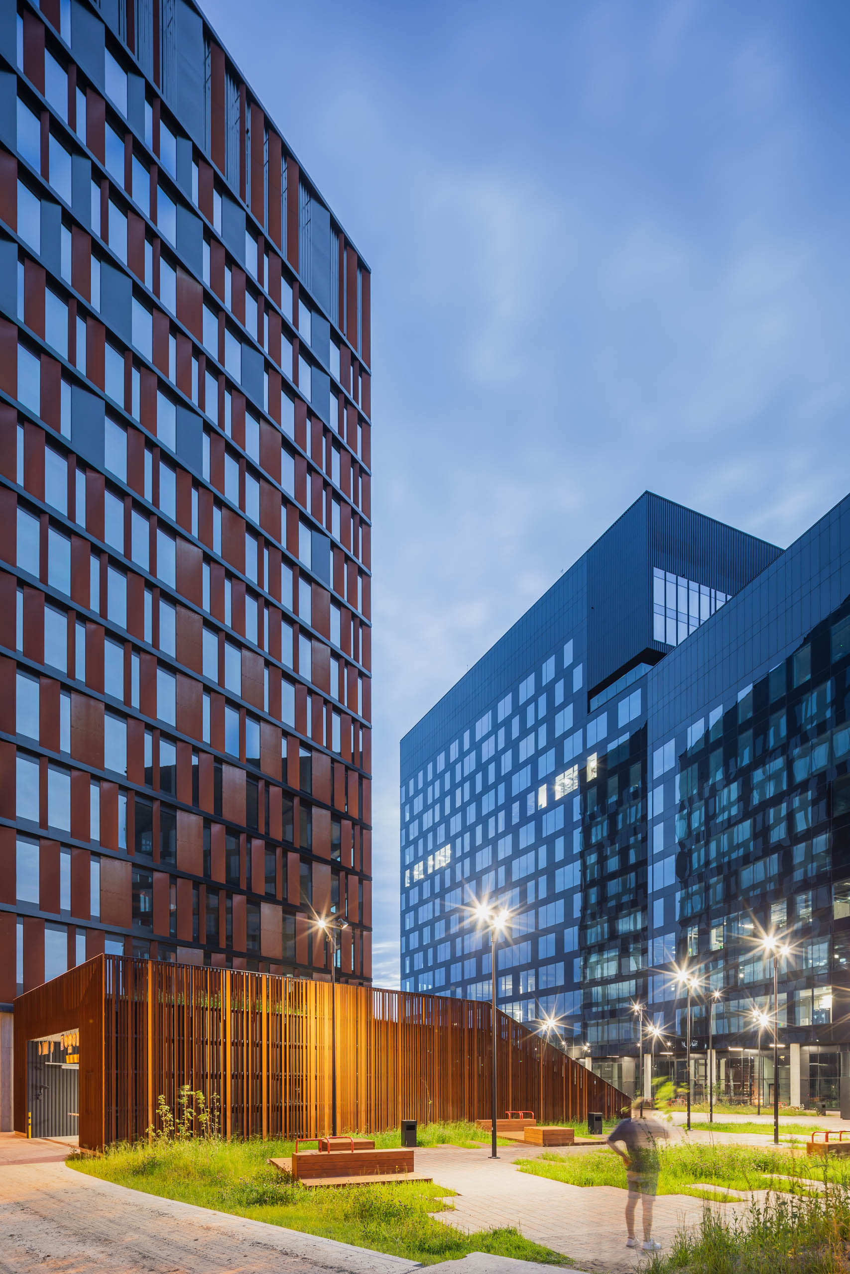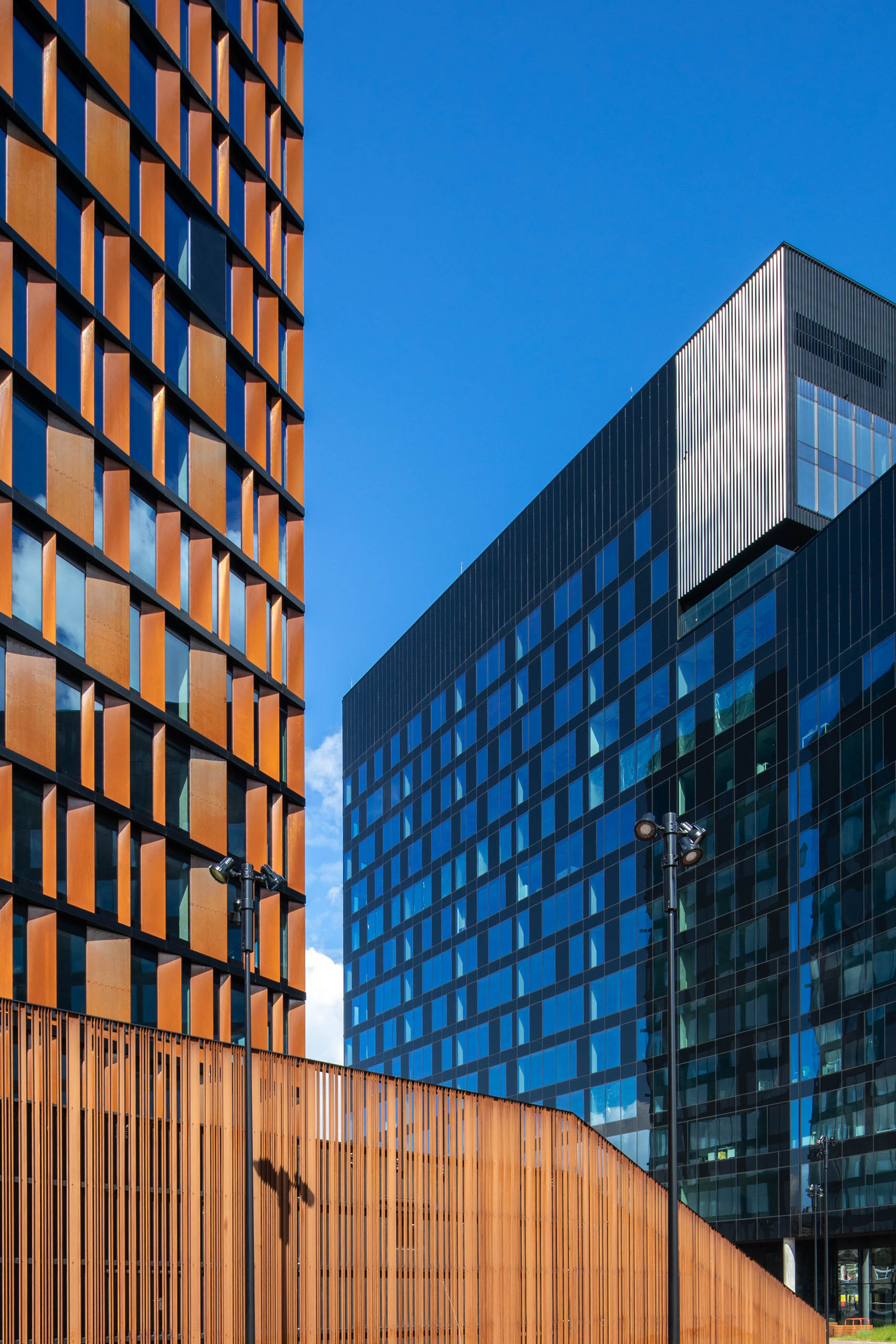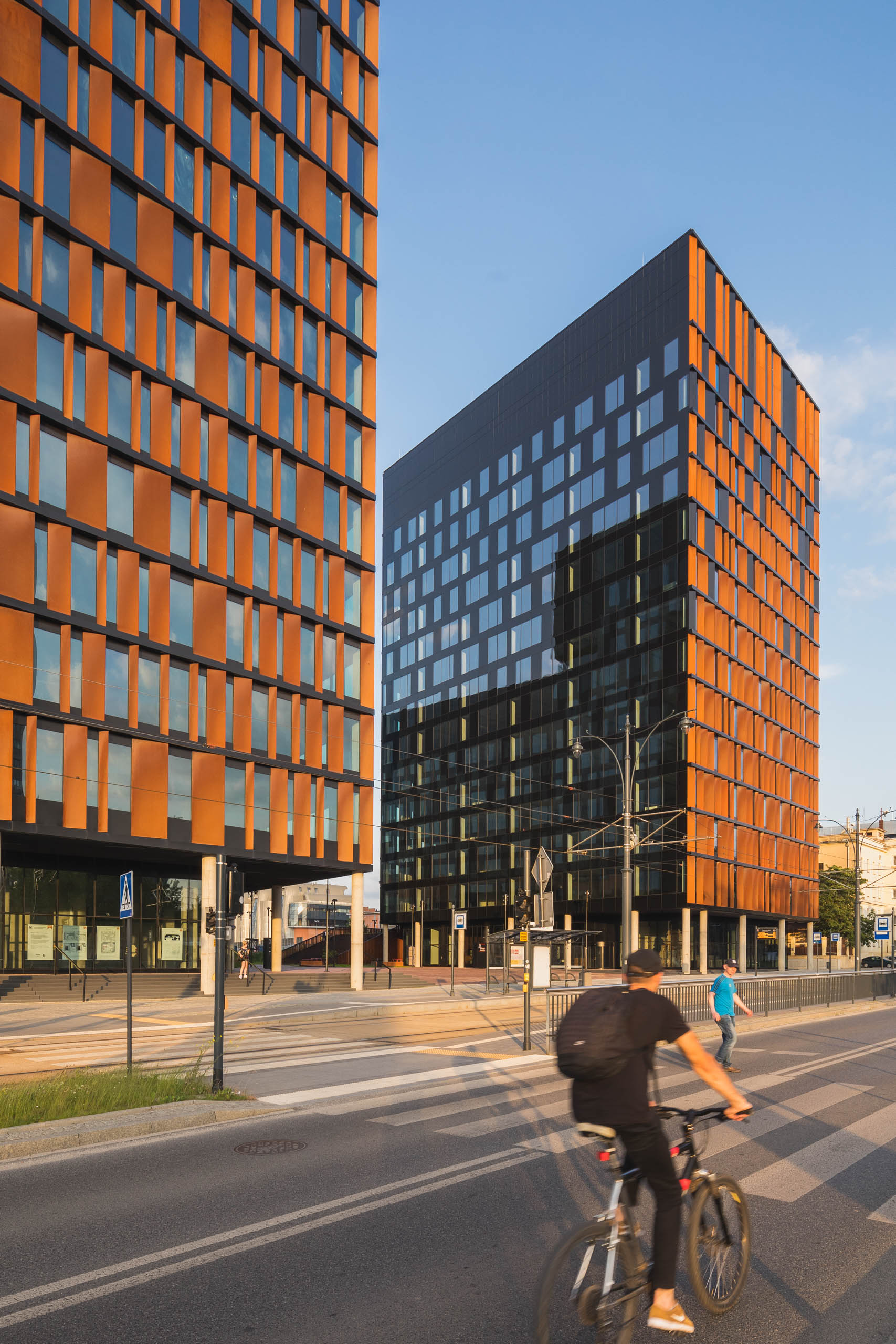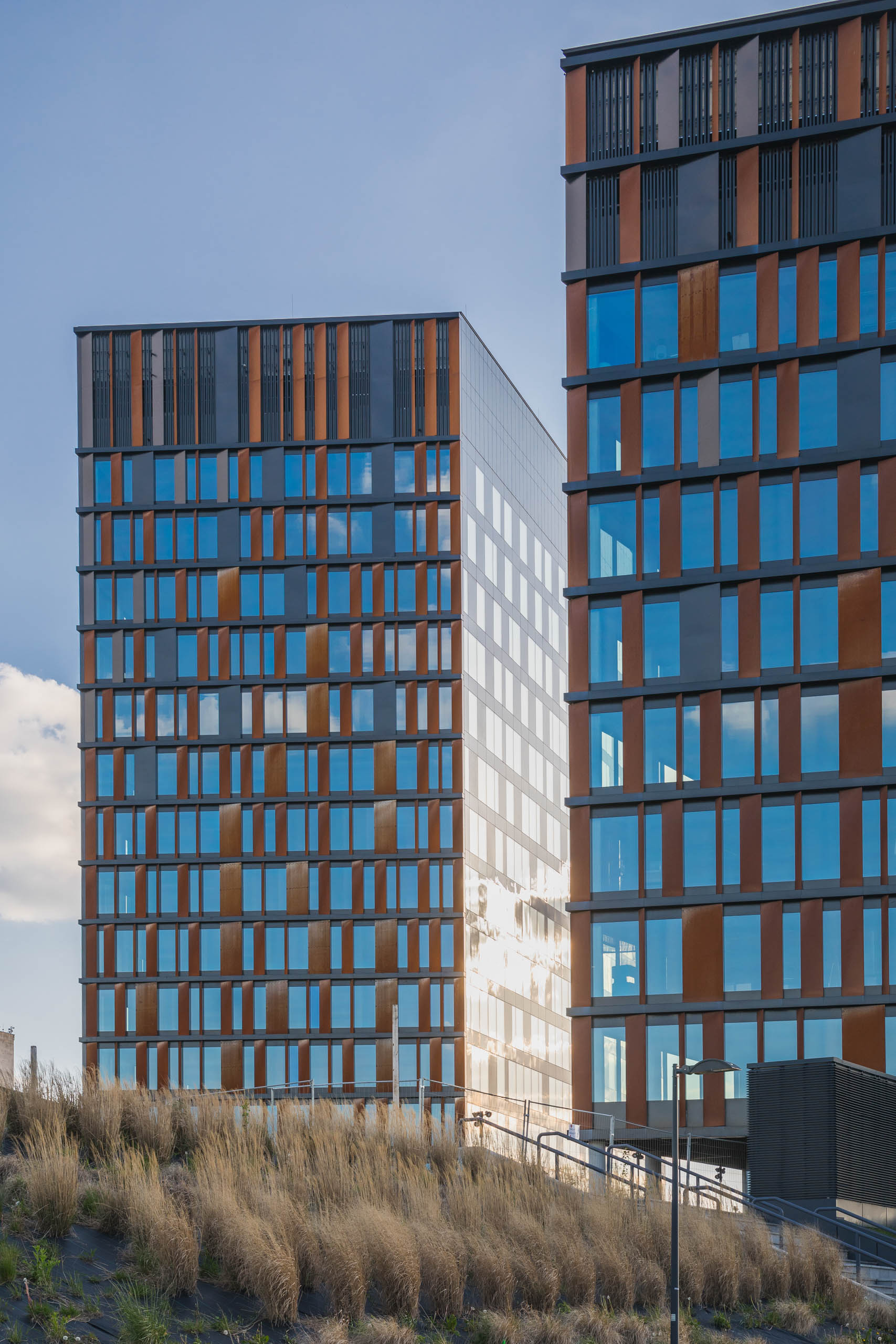 Elewacje pokryte mozaiką paneli z cortenu i czarnej blachy nadają bryle przestrzennego wymiaru, wywołując wrażenia zmieniające się w wraz z punktem patrzenia. Taniec tych wielkich brył staje się dynamiczny z perspektywy podróżujących jedną z dróg przelotowych, biegnących w sąsiedztwie budynków.