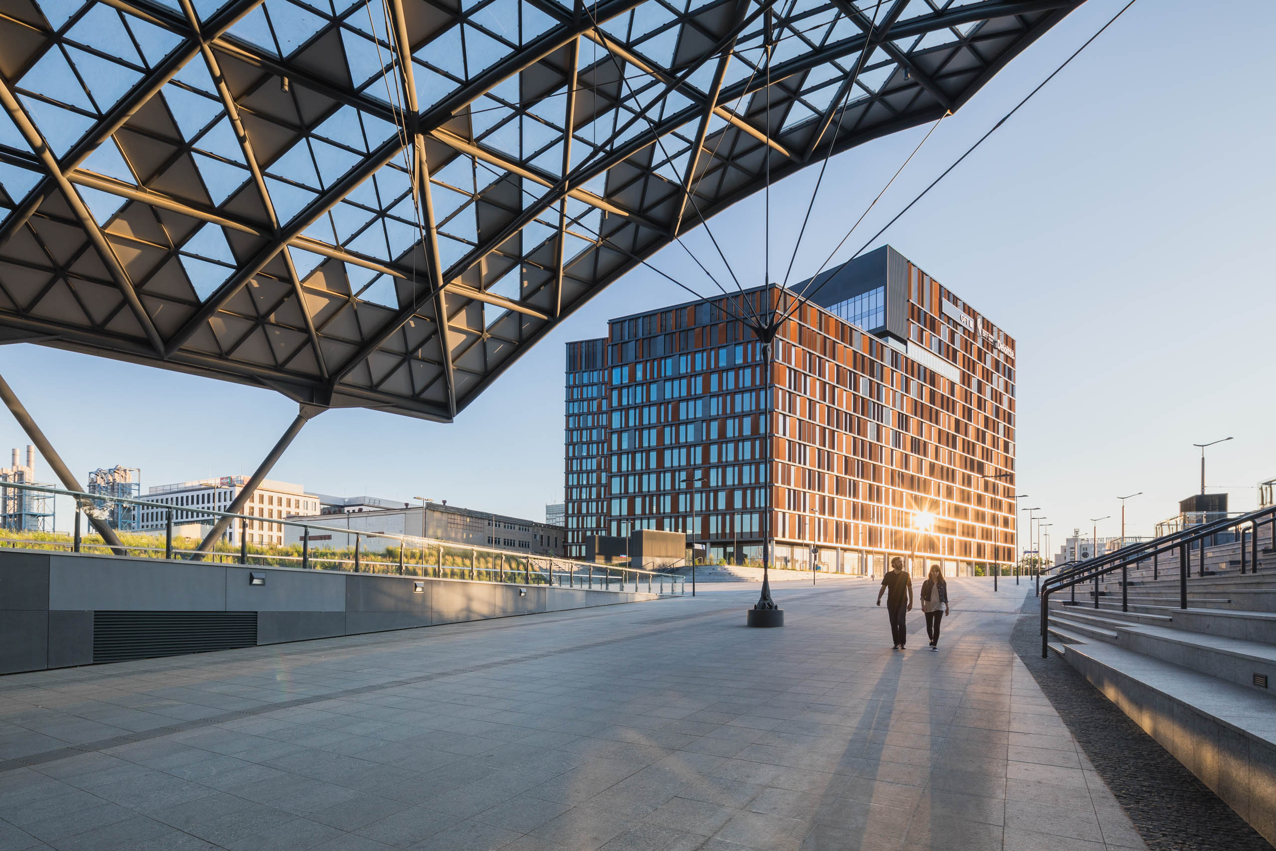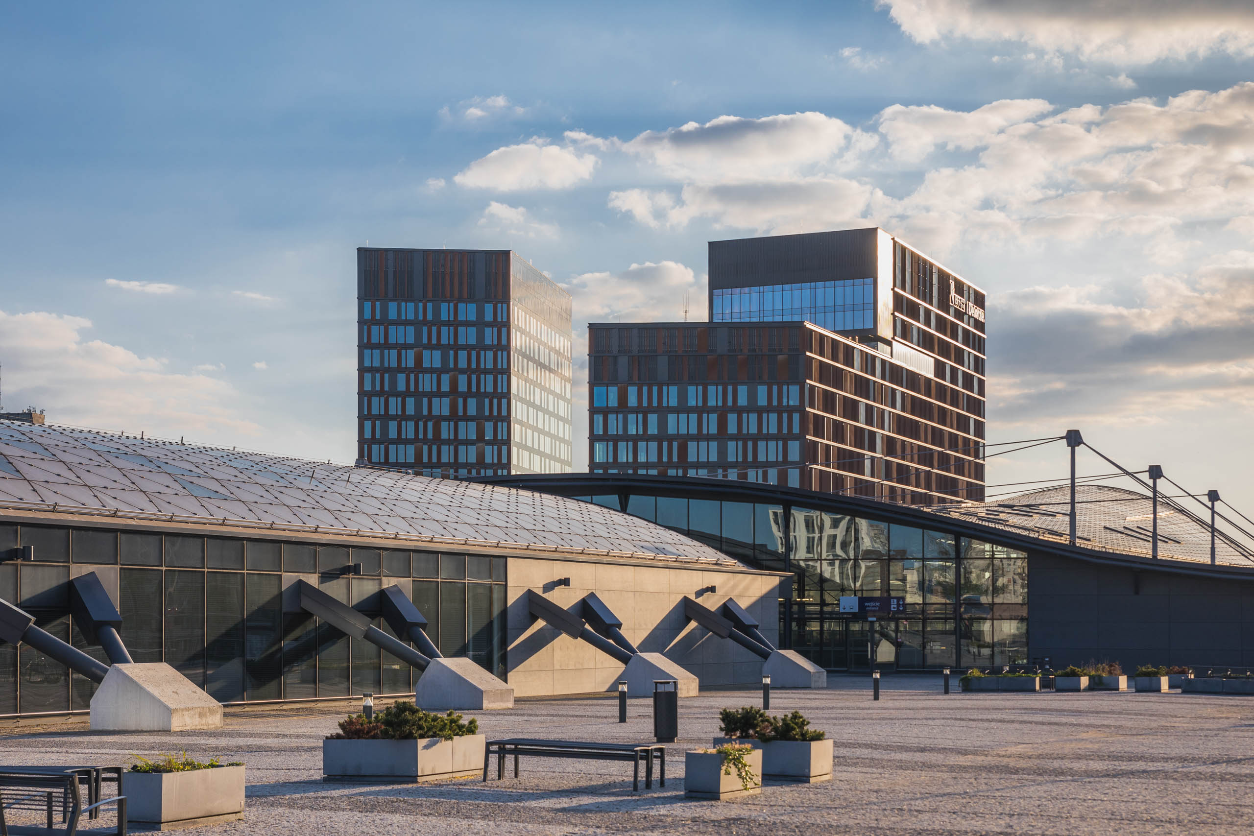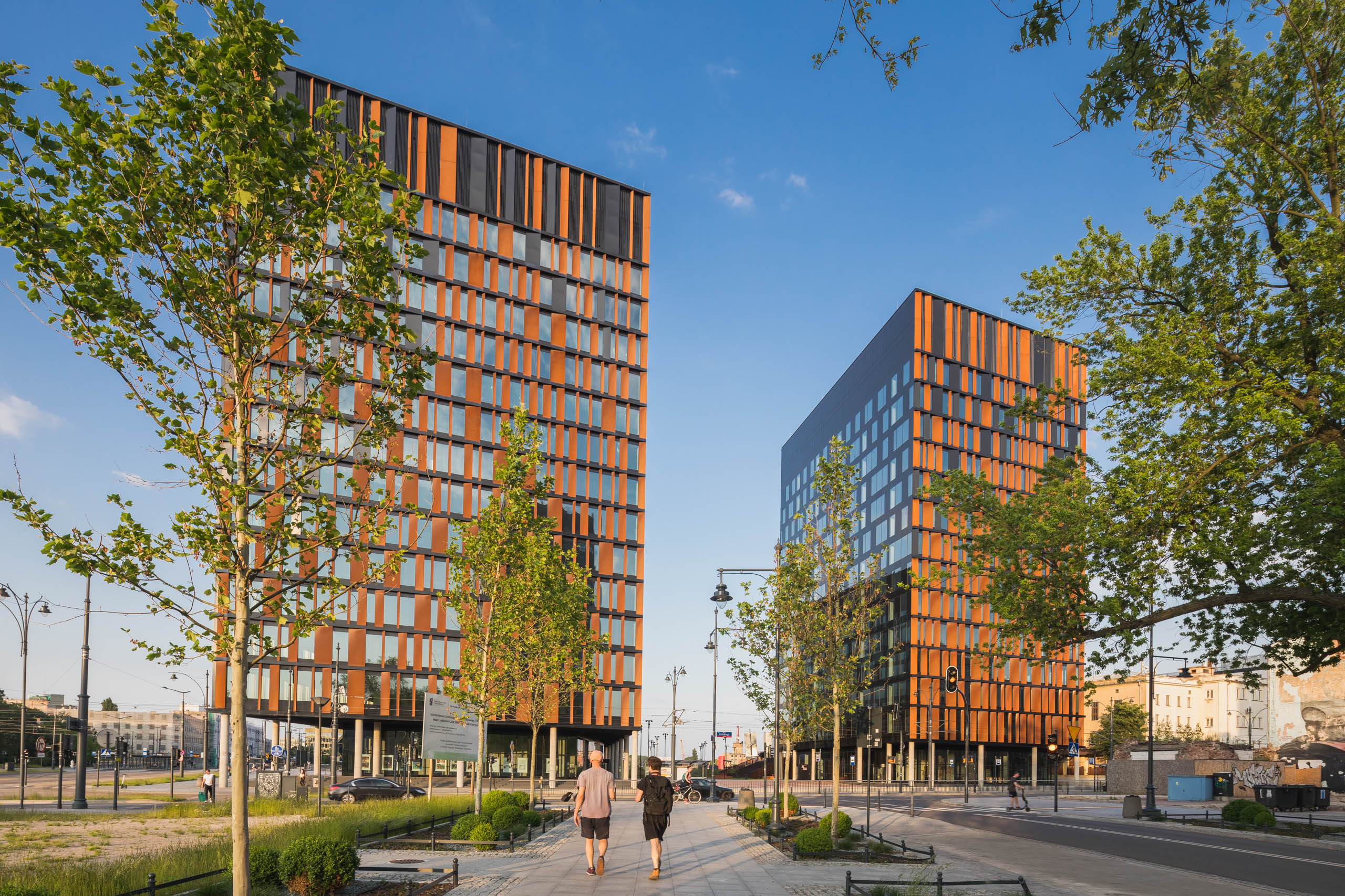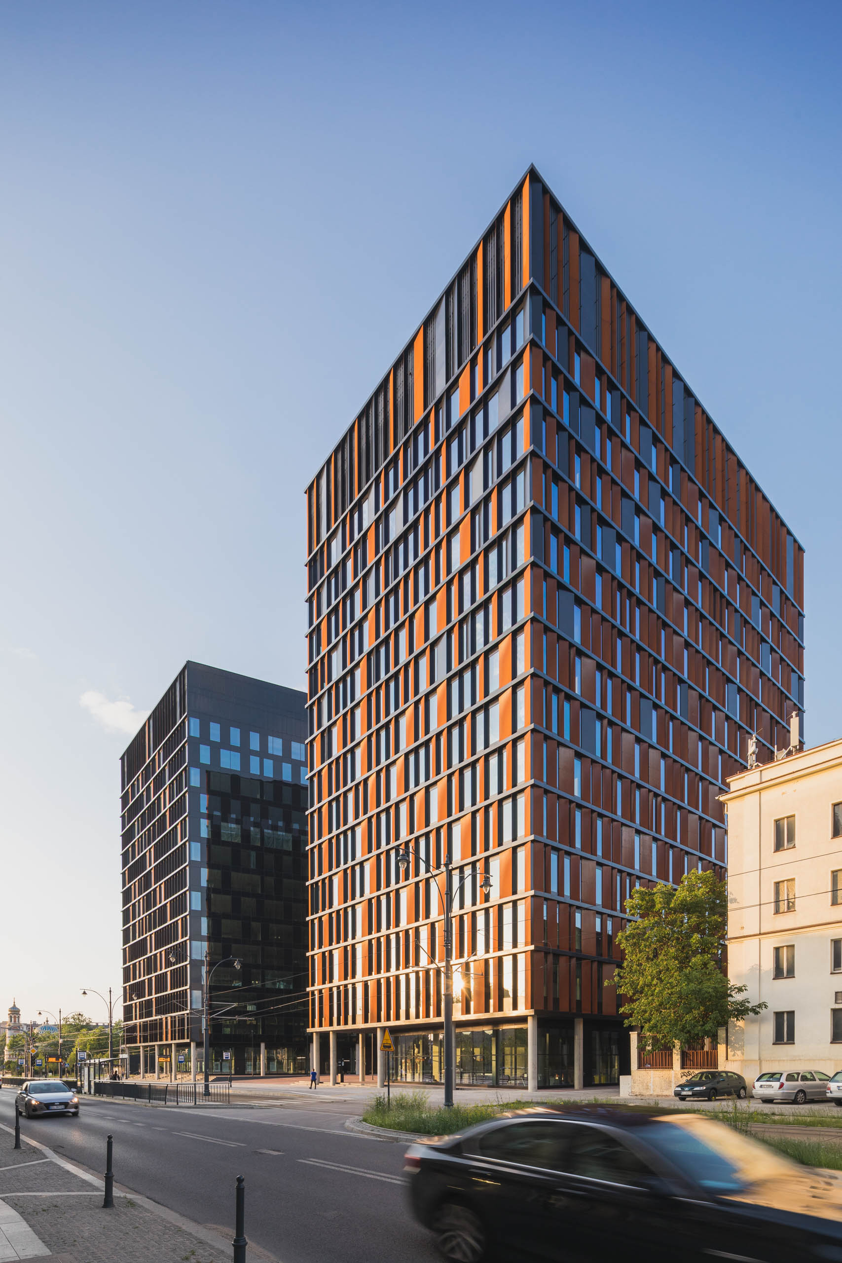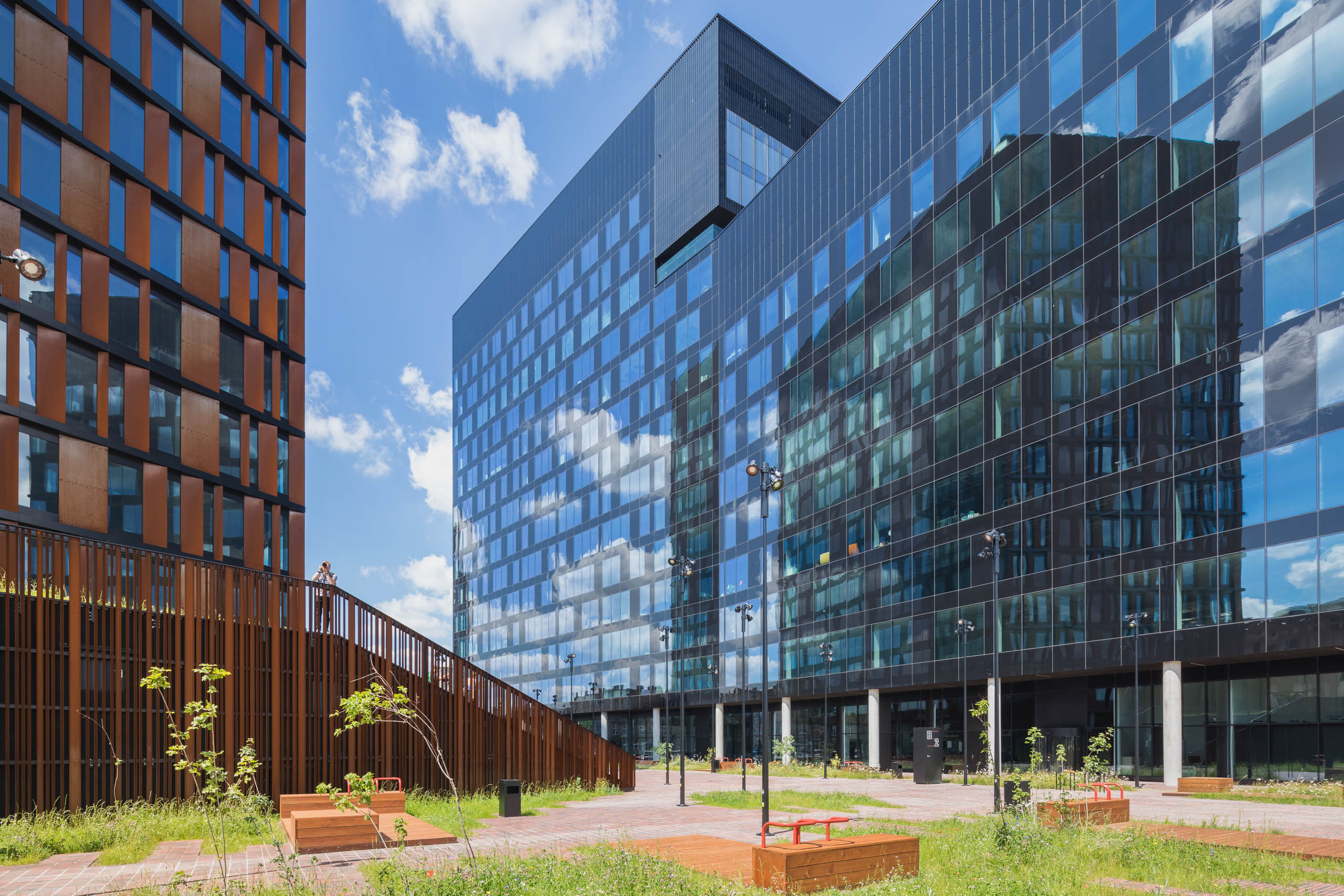 Elewacje pokryte mozaiką paneli z cortenu i czarnej blachy nadają bryle przestrzennego wymiaru, wywołując wrażenia zmieniające się w wraz z punktem patrzenia. Taniec tych wielkich brył staje się dynamiczny z perspektywy podróżujących jedną z dróg przelotowych, biegnących w sąsiedztwie budynków.