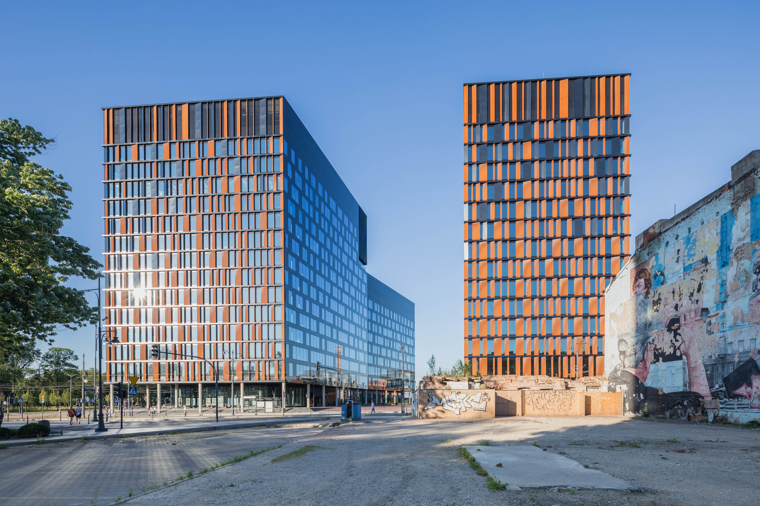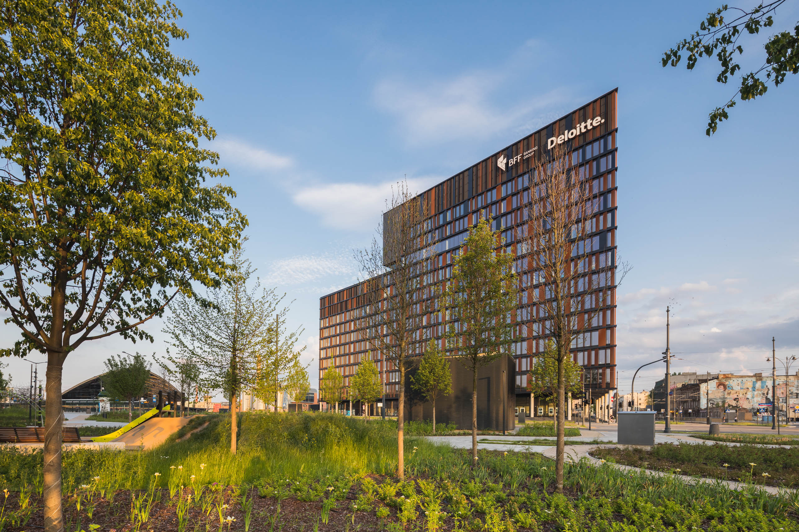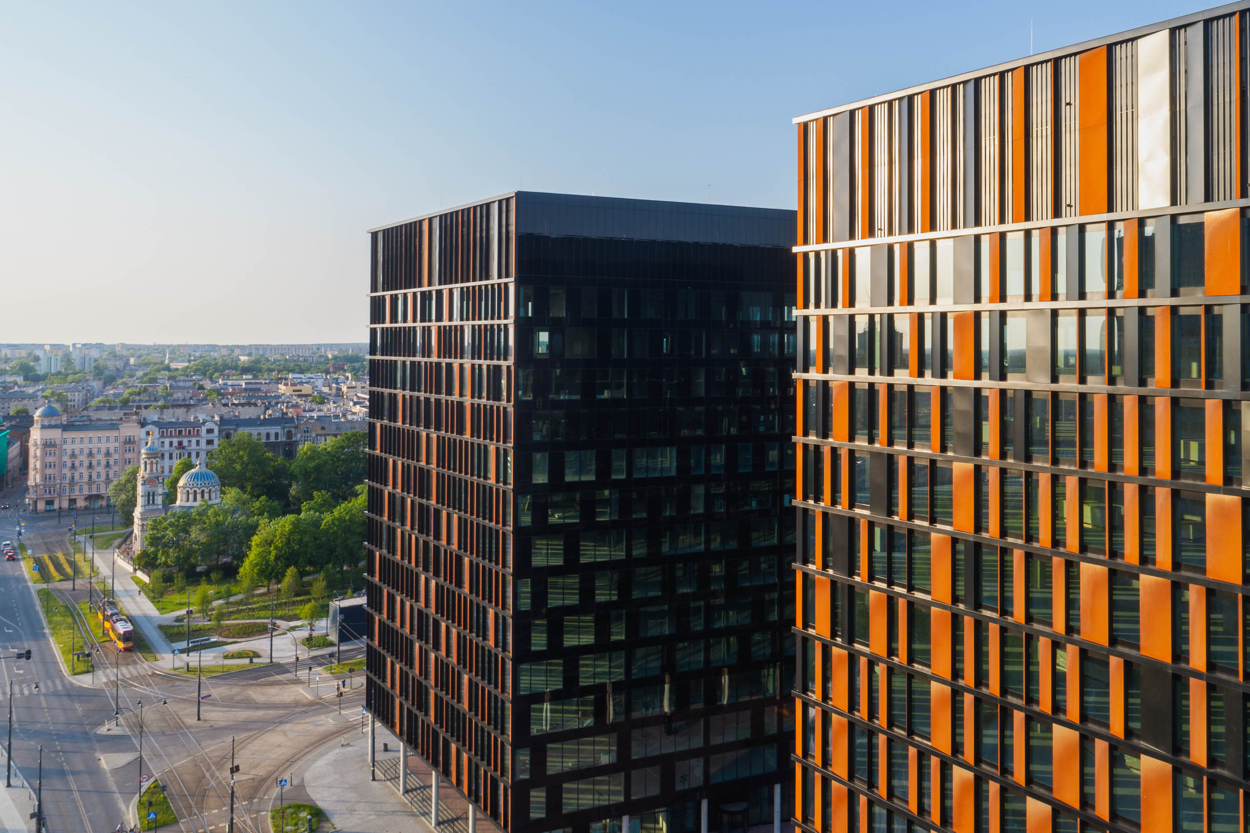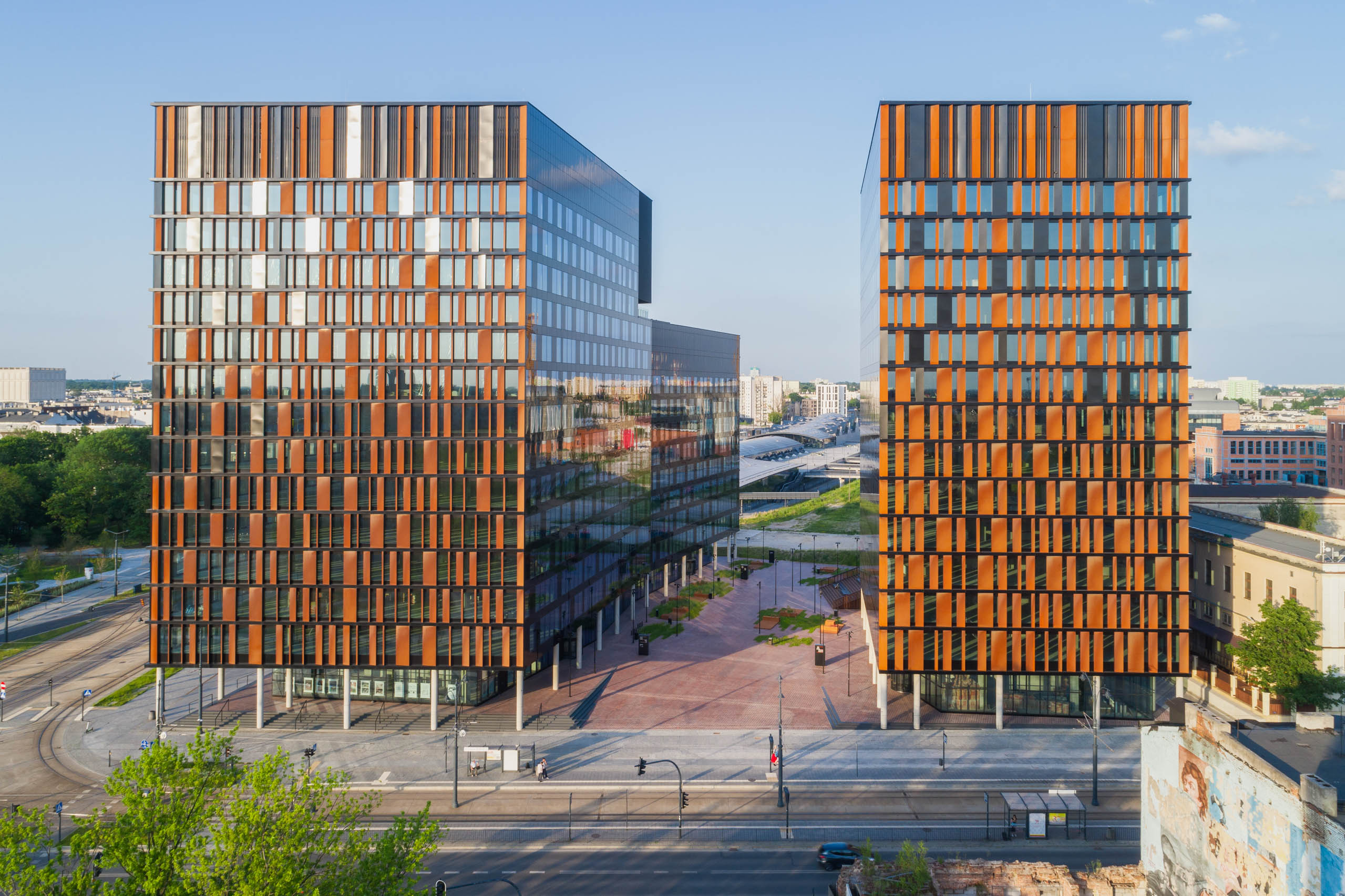 Brama Miasta otwiera się na nie tylko formalnie, ale również funkcjonalnie. W parterze zaprojektowano lokale usługowe i gastronomiczne. Bufor między budynkami wypełniają przestrzenie rekreacyjne zaaranżowane jako zielona enklawę Nowego Centrum Łodzi.