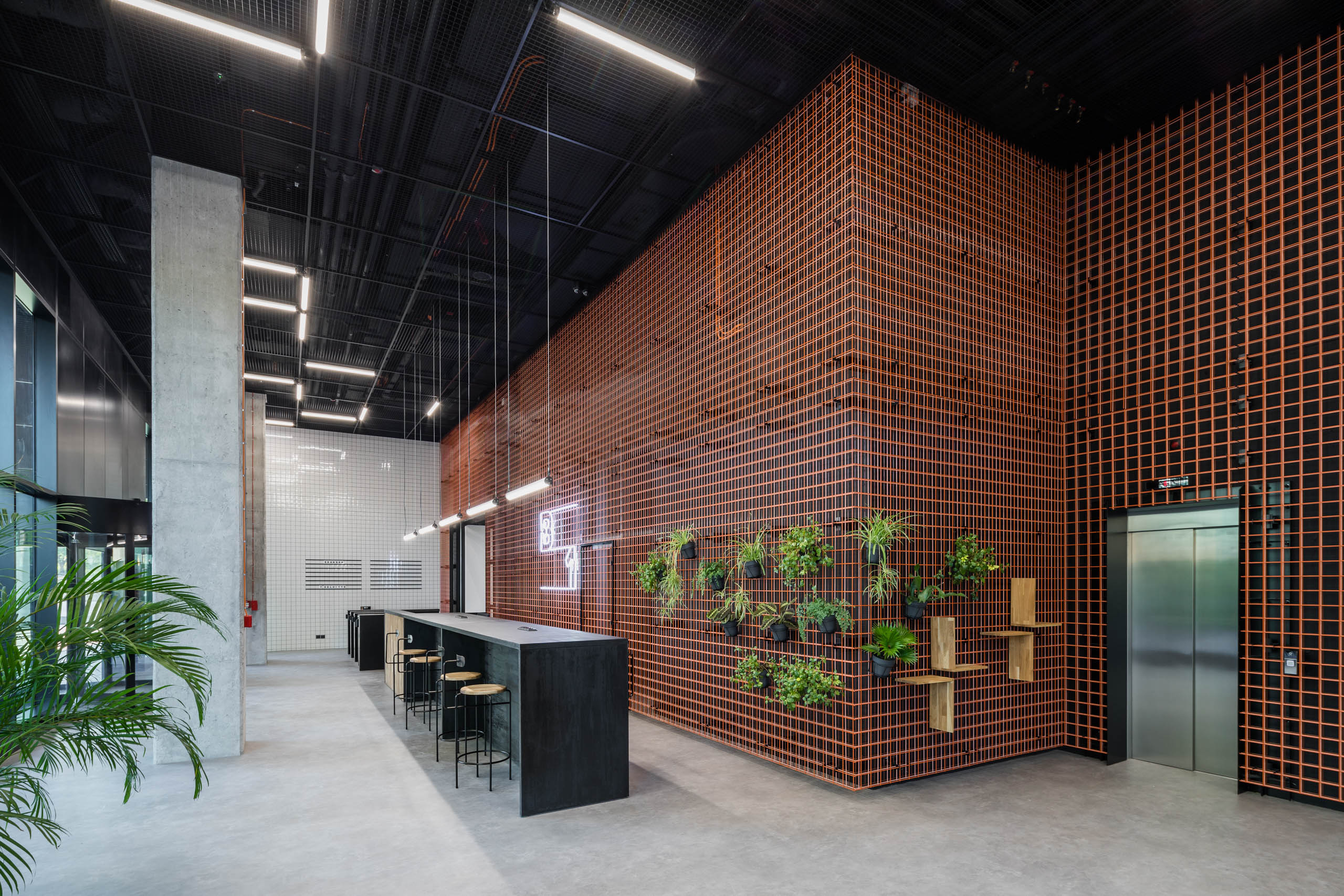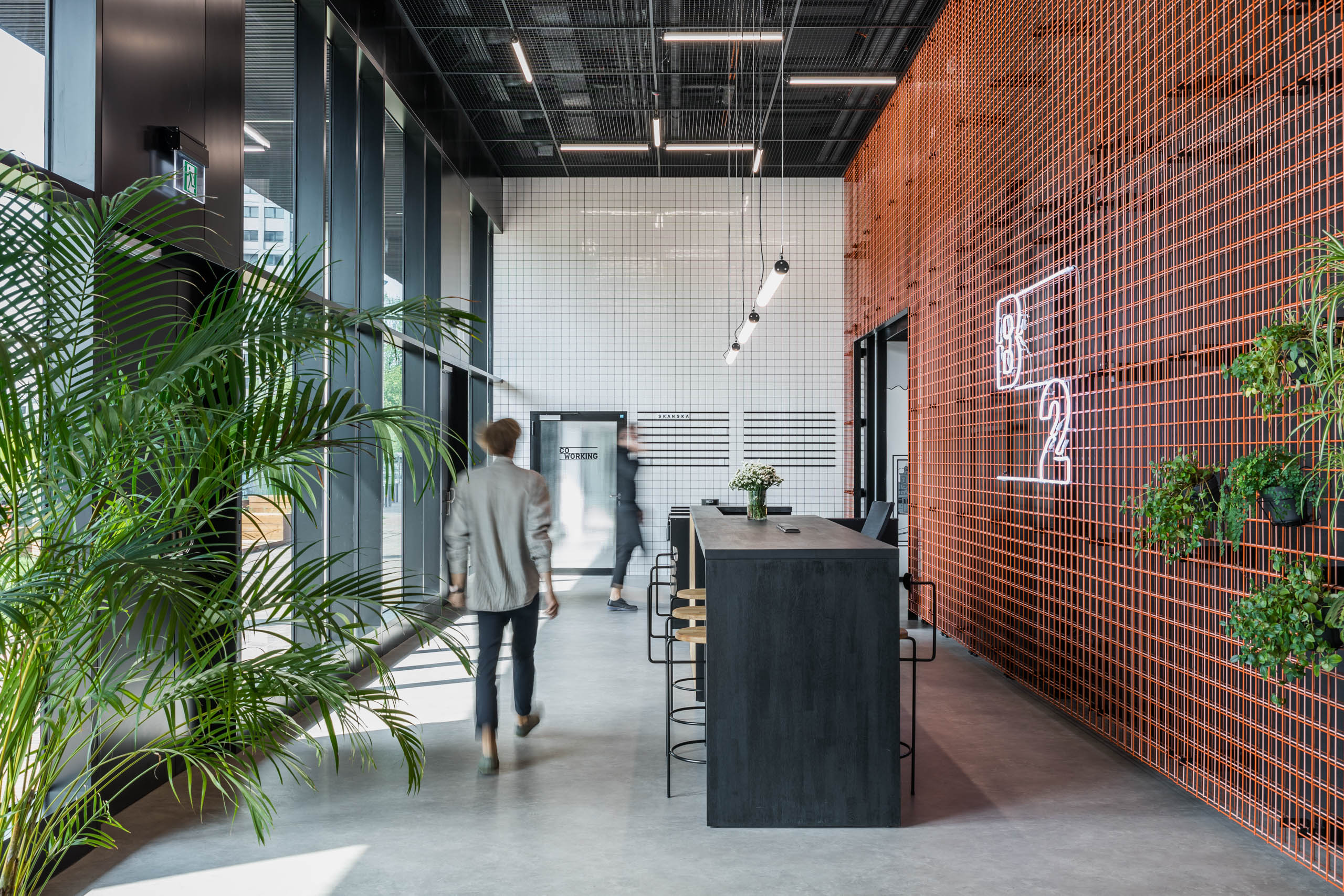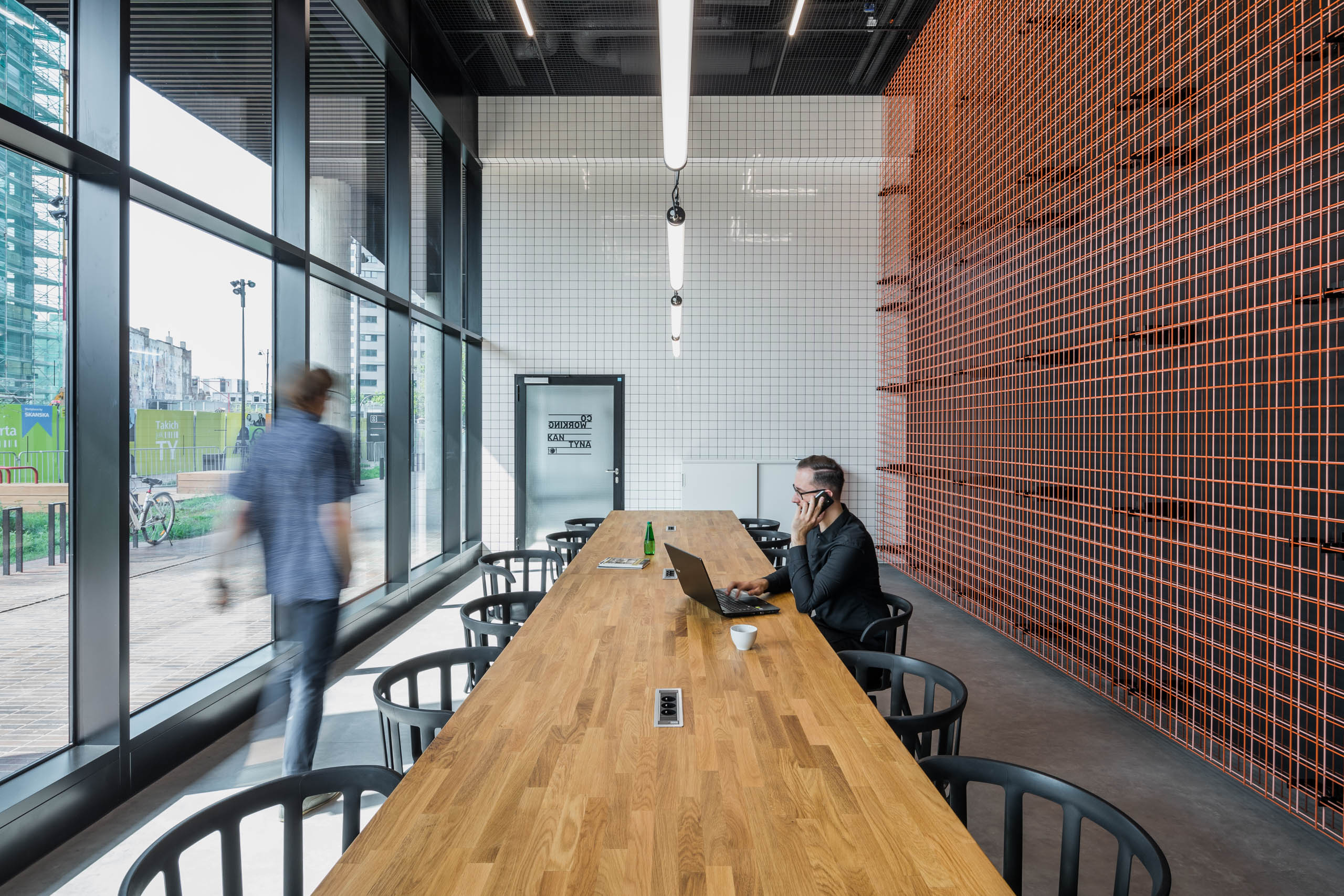 Część parteru zapewnia pracownikom i odwiedzającym ich gościom strefę coworkingową. Zadaszenie rampy zjazdowej do garażu zaprojektowano jako układ drewnianych trybun, na których pracownicy biurowców mogą skorzystać z przerwy w pracy. W letnie wieczory miejsce to służyć może jako widownia dla kina plenerowego, nawiązując do bogatych tradycji Łódzkiej Szkoły Filmowej.