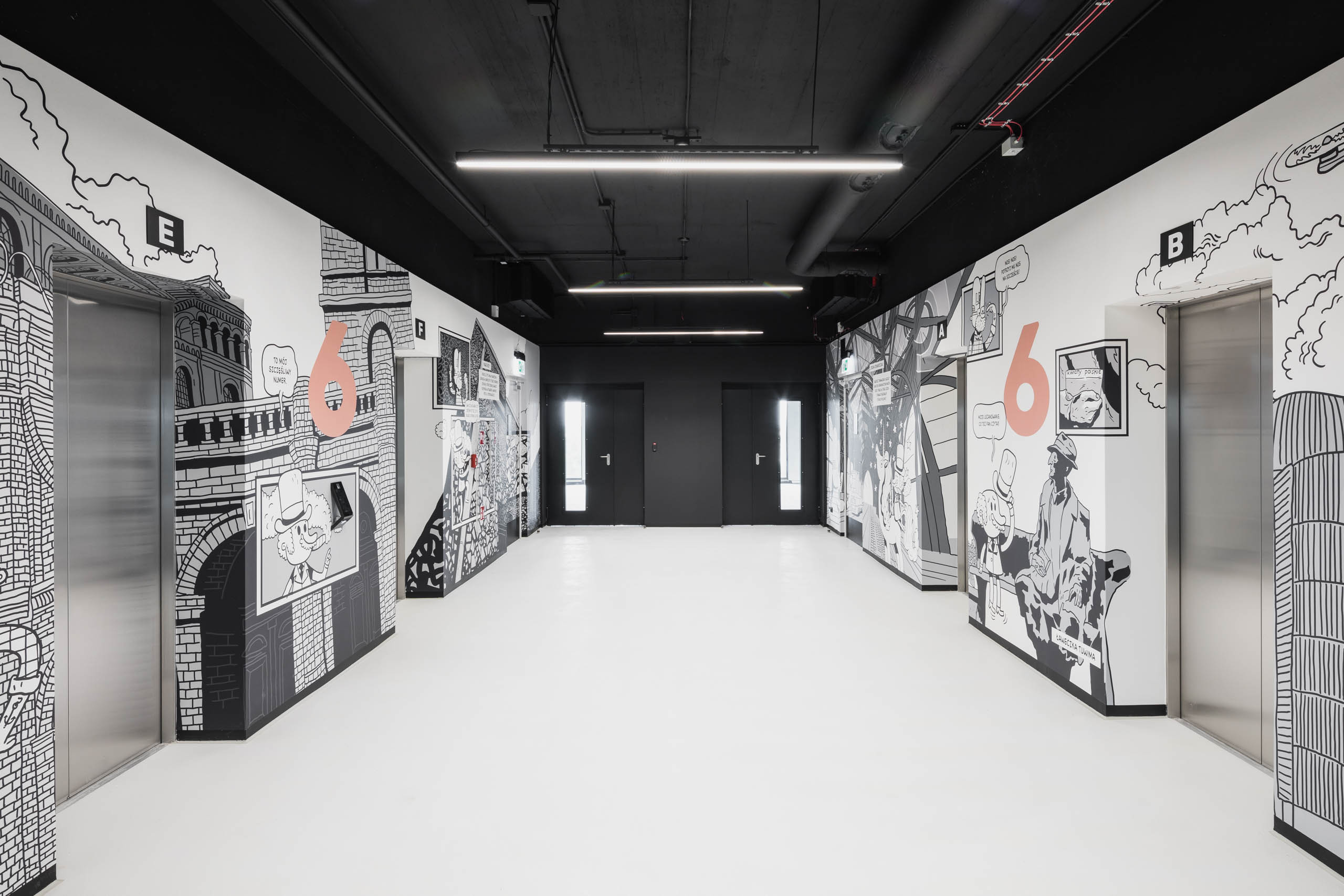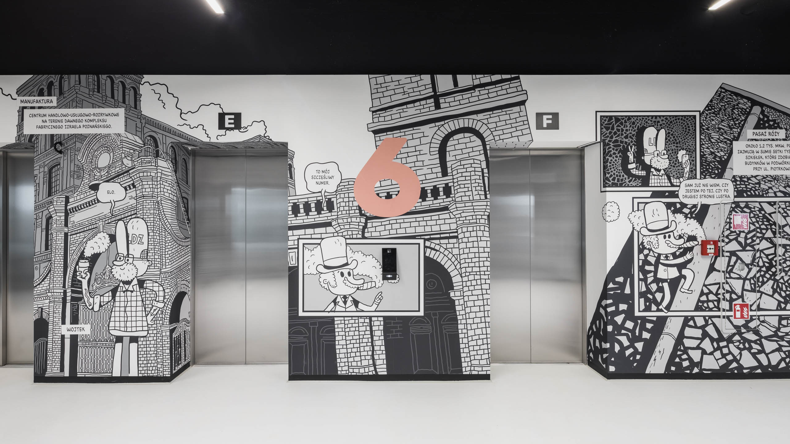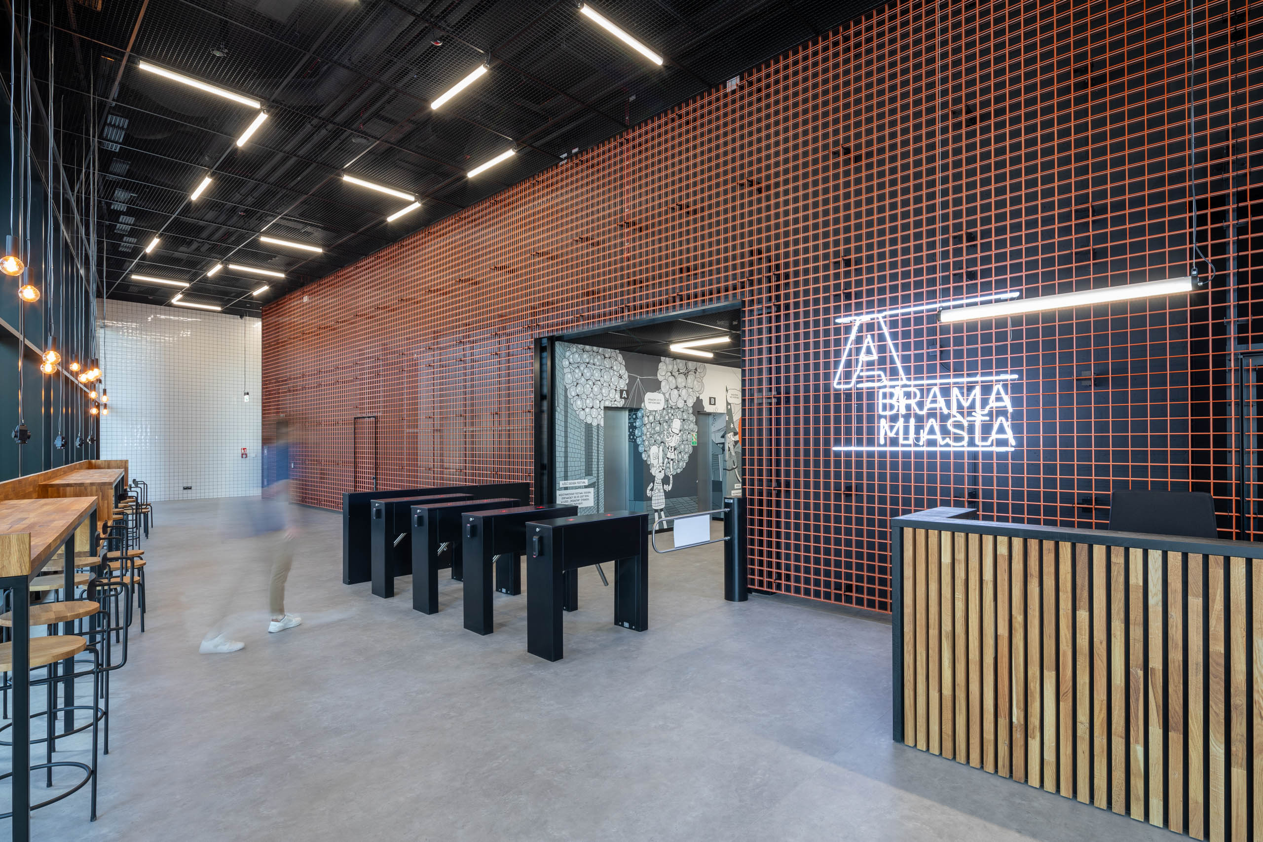 Dumna ze swoich tradycji Łódź kojarzona jest dziś jednocześnie jako miasto festiwali, tygodnia mody i designu przyciągające młodych, kreatywnych ludzi. Estetyka Bramy Miasta jest tego odzwierciedleniem, dlatego wnętrza wszystkich holi windowych pokrywają komiksowe grafiki nawiązujące do XIX-wiecznych tradycji przemysłowych potentatów ważnych dla historii miasta.