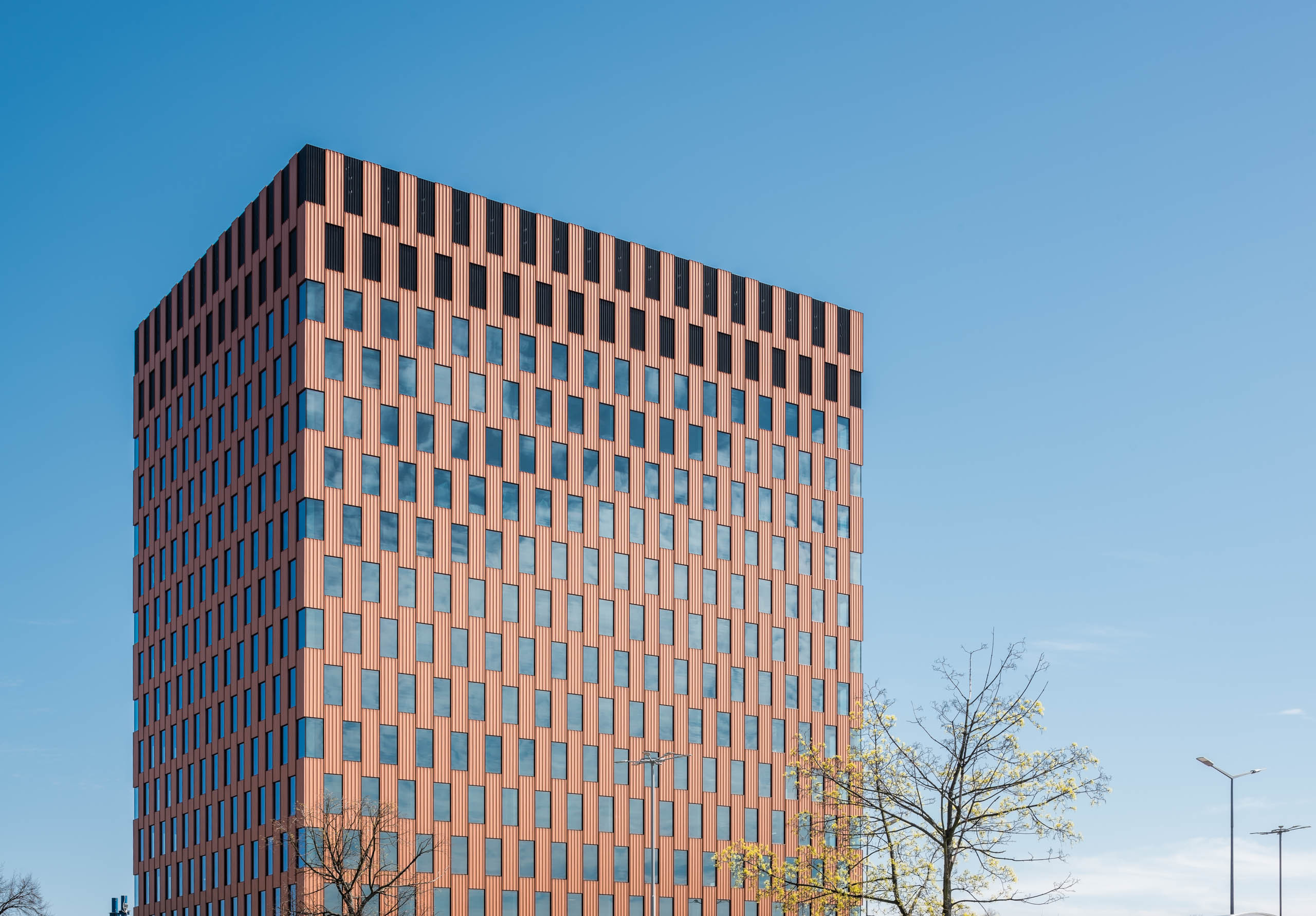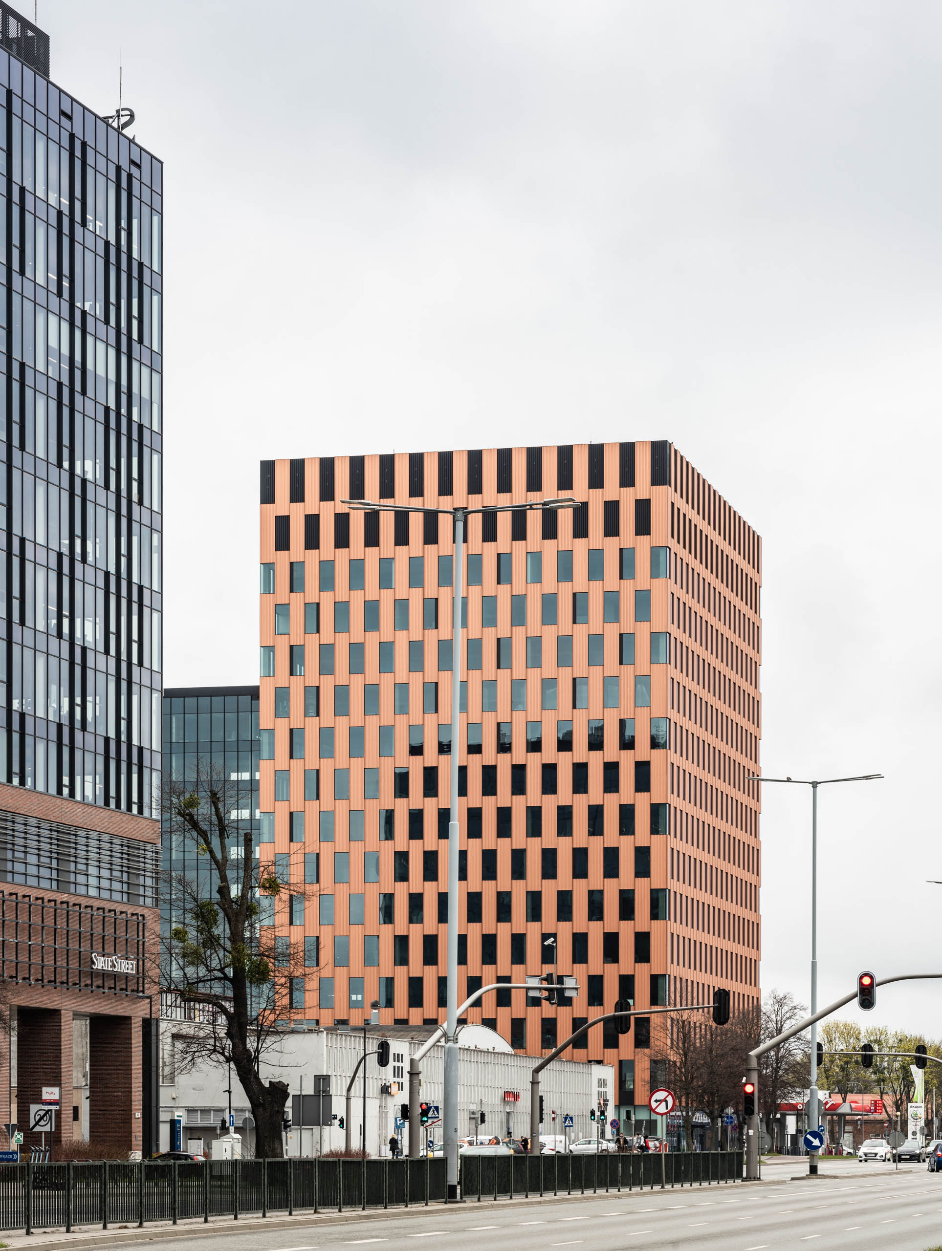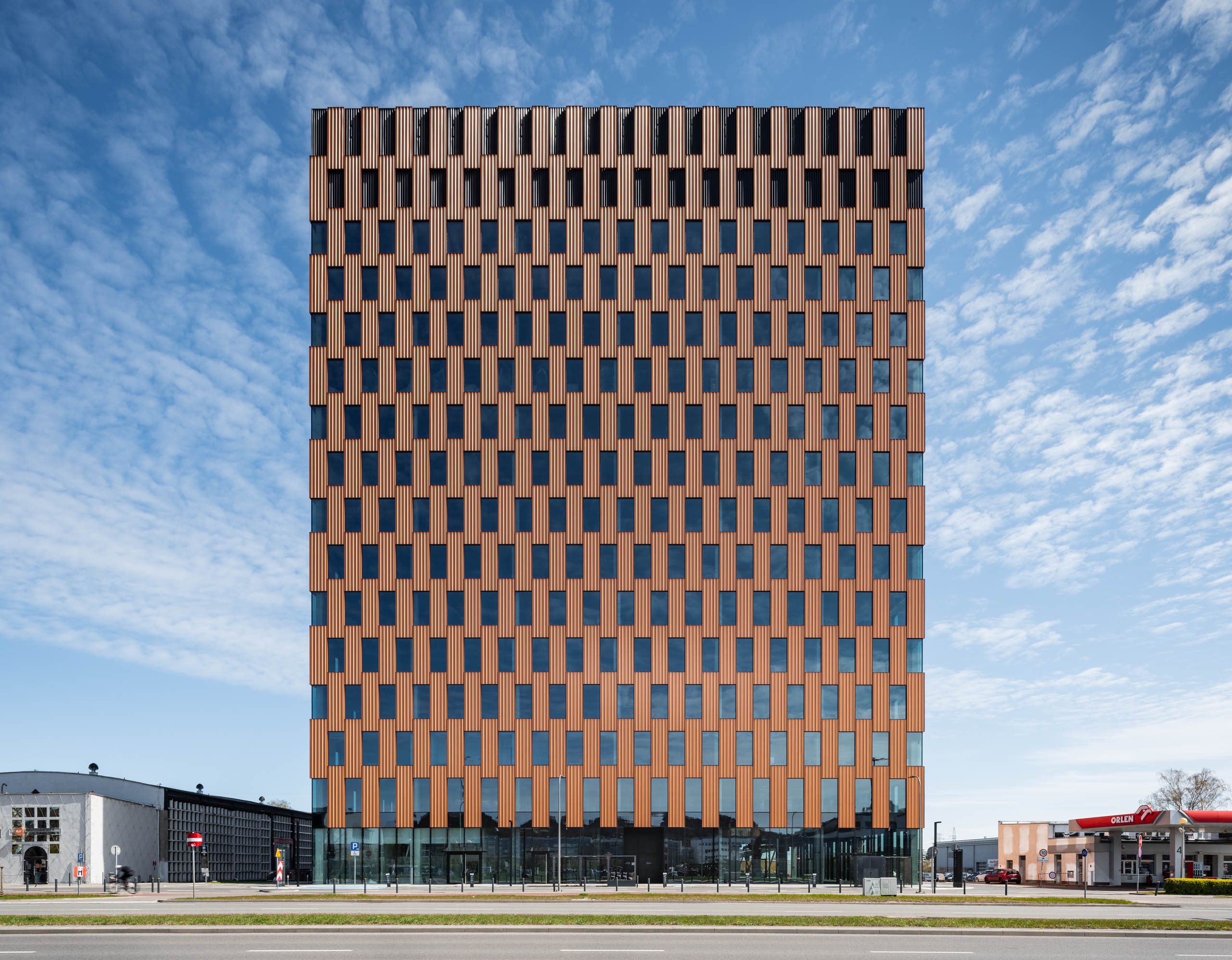 Stalowa fasada z elementów modułowych o rudej, bursztynowej barwie z charakterystycznymi, pionowymi podziałami była dla nas racjonalnym wyborem. To czytelne nawiązanie do prostej i funkcjonalnej retoryki portowych składów kontenerowych, których prostopadłościany ułożone jeden na drugim tworzą przestrzenne formy. Powtarzalność, modułowość, efekt typizacji wzbogaciliśmy poprzez grę szklanymi podziałami, które dematerializują bryłę.