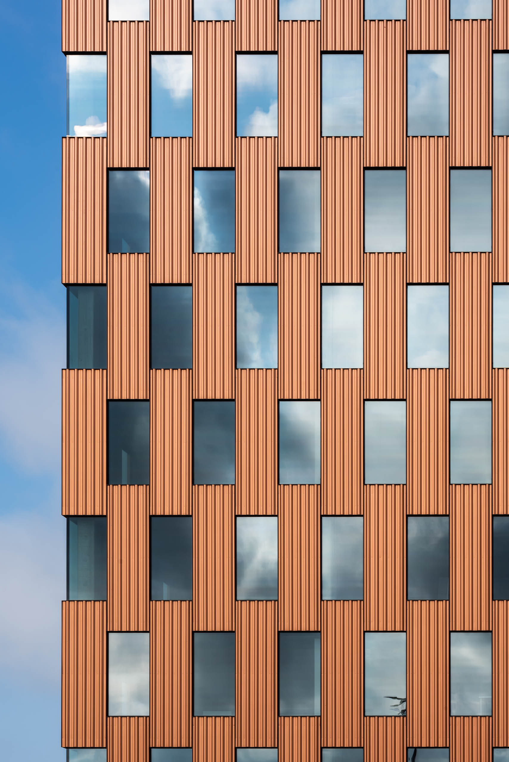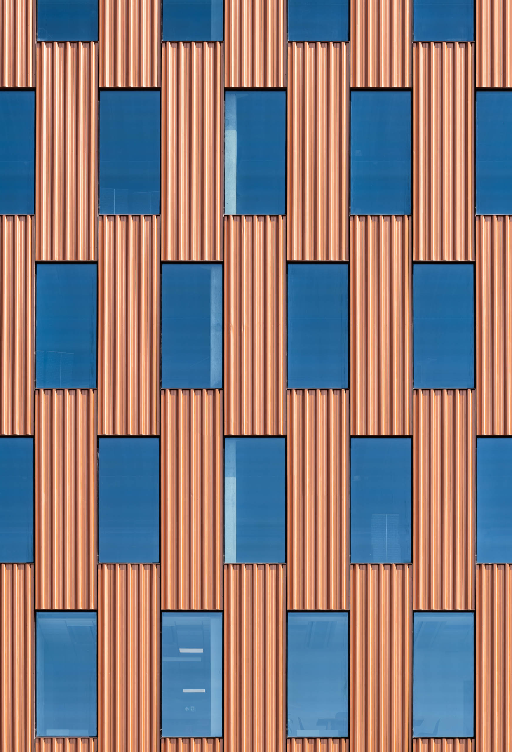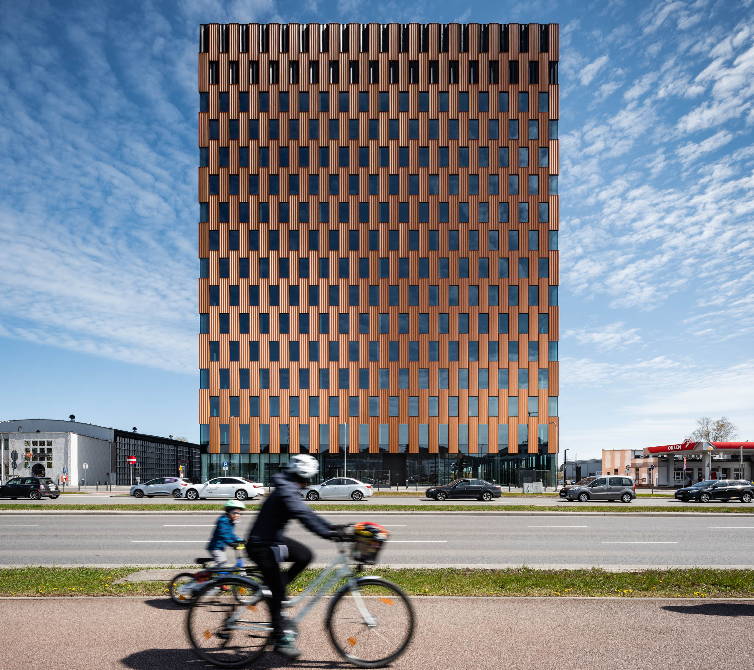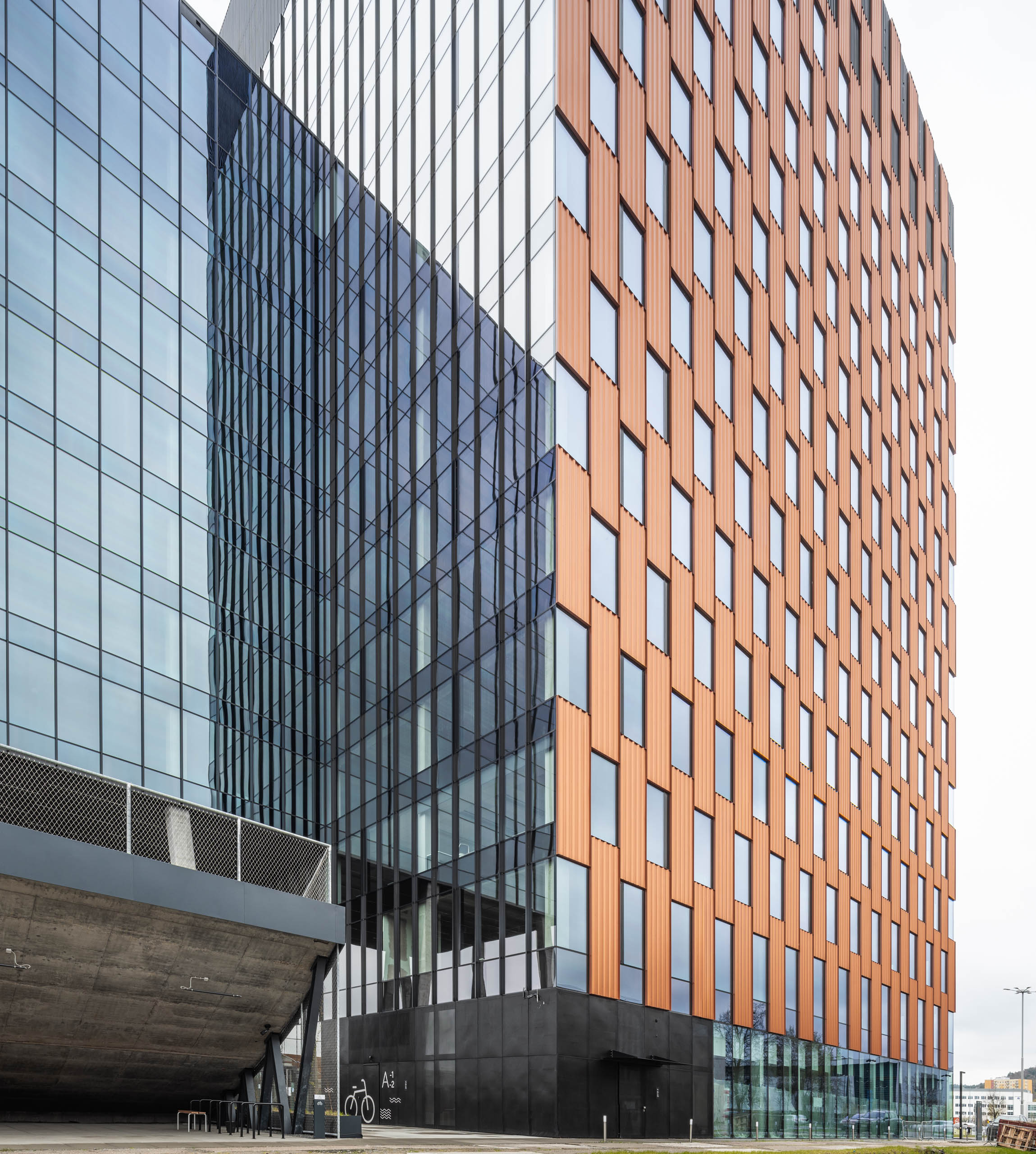 Stalowa fasada z elementów modułowych o rudej, bursztynowej barwie z charakterystycznymi, pionowymi podziałami była dla nas racjonalnym wyborem. To czytelne nawiązanie do prostej i funkcjonalnej retoryki portowych składów kontenerowych, których prostopadłościany ułożone jeden na drugim tworzą przestrzenne formy. Powtarzalność, modułowość, efekt typizacji wzbogaciliśmy poprzez grę szklanymi podziałami, które dematerializują bryłę.