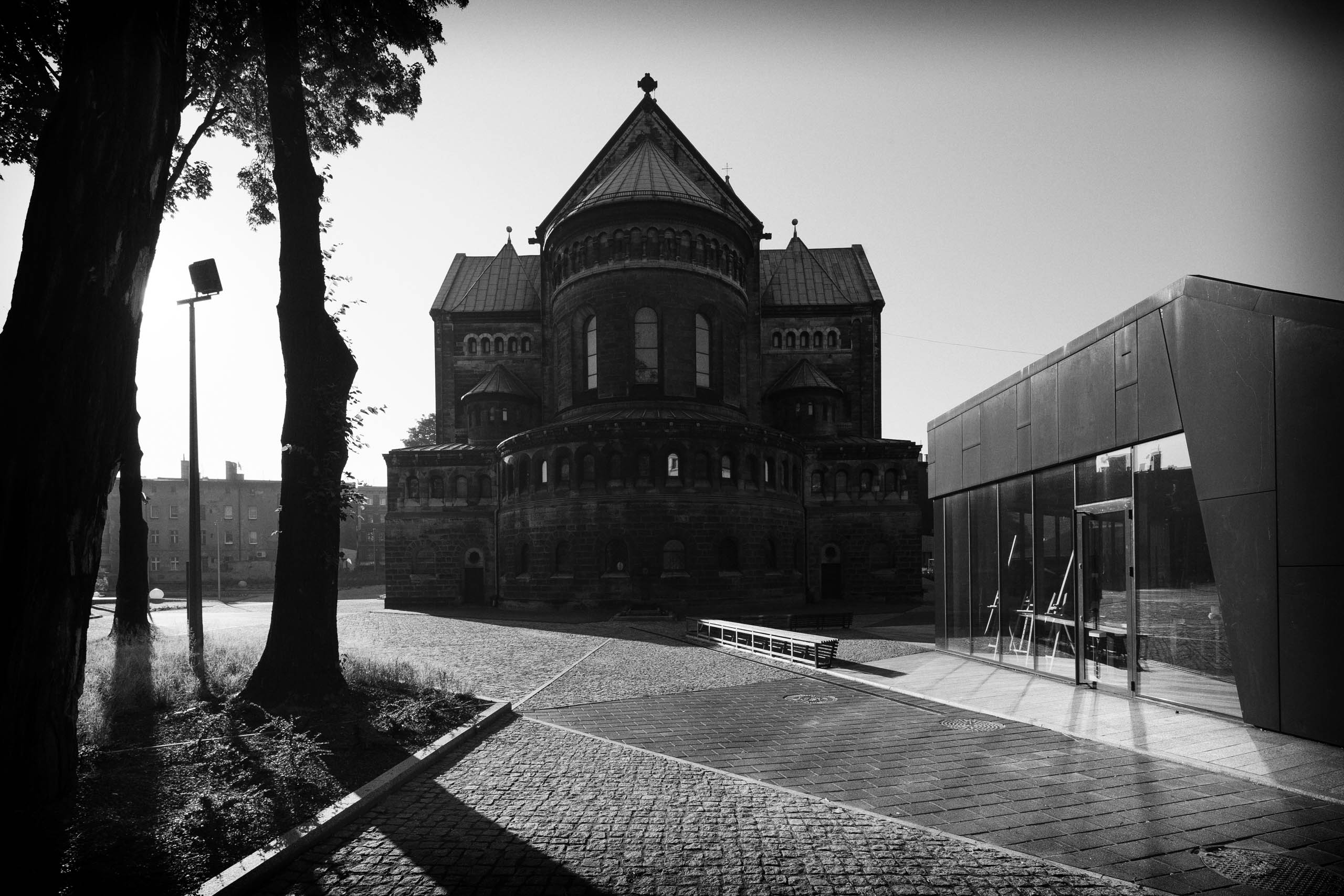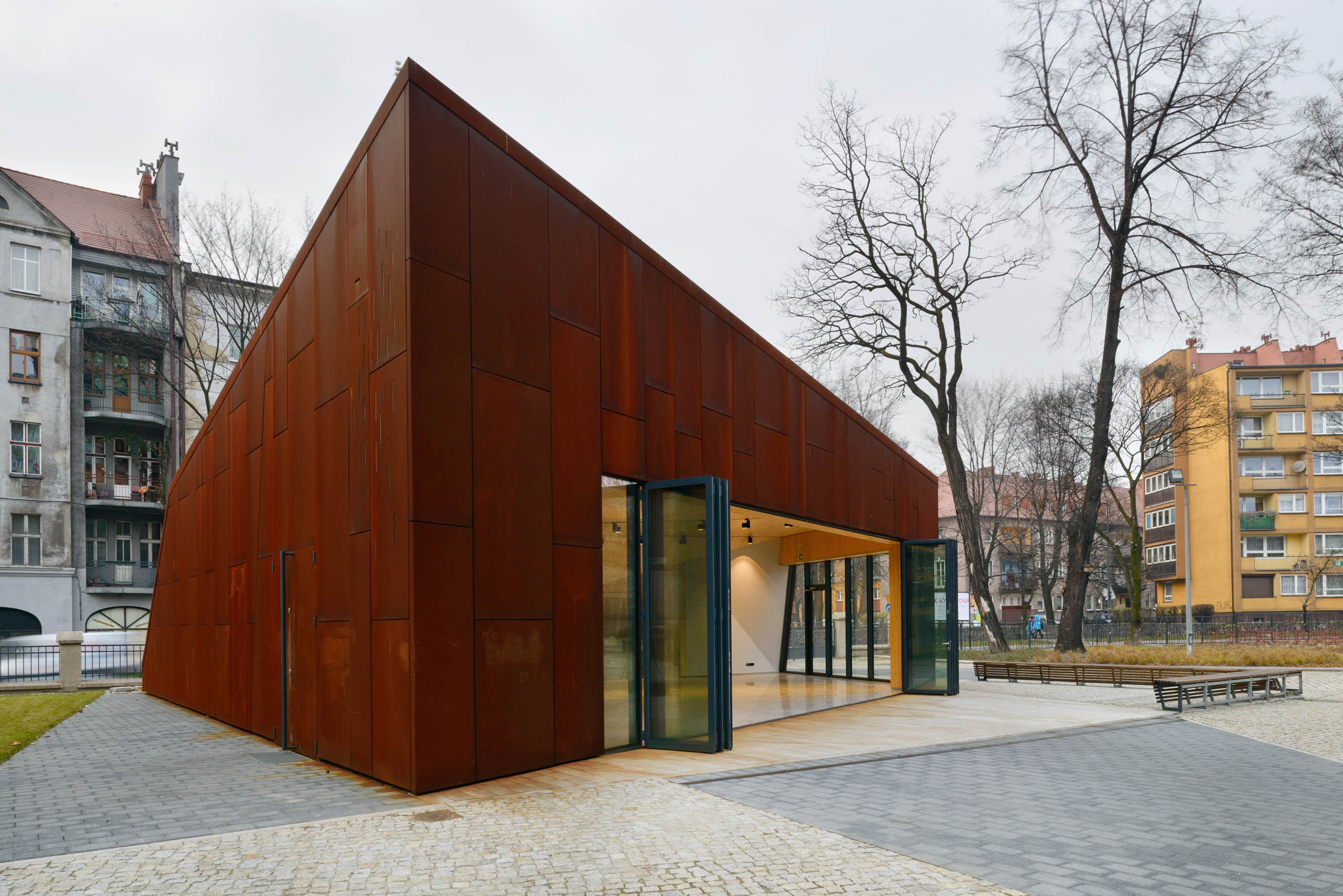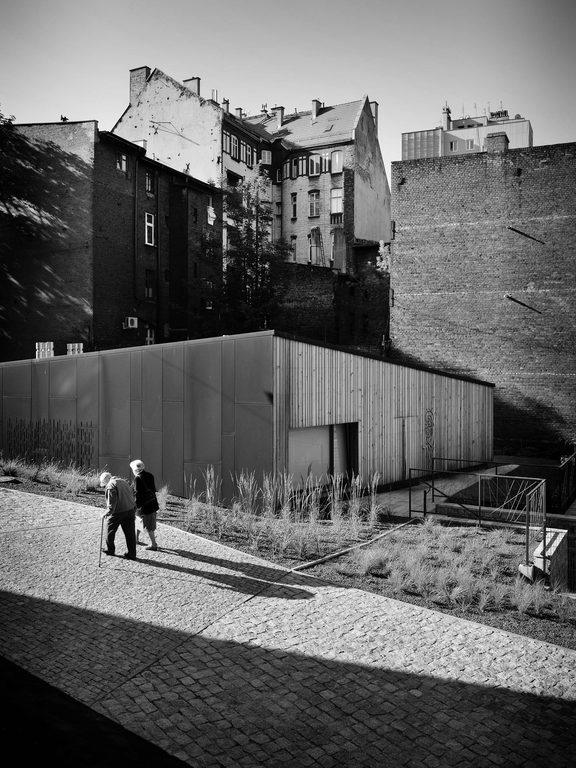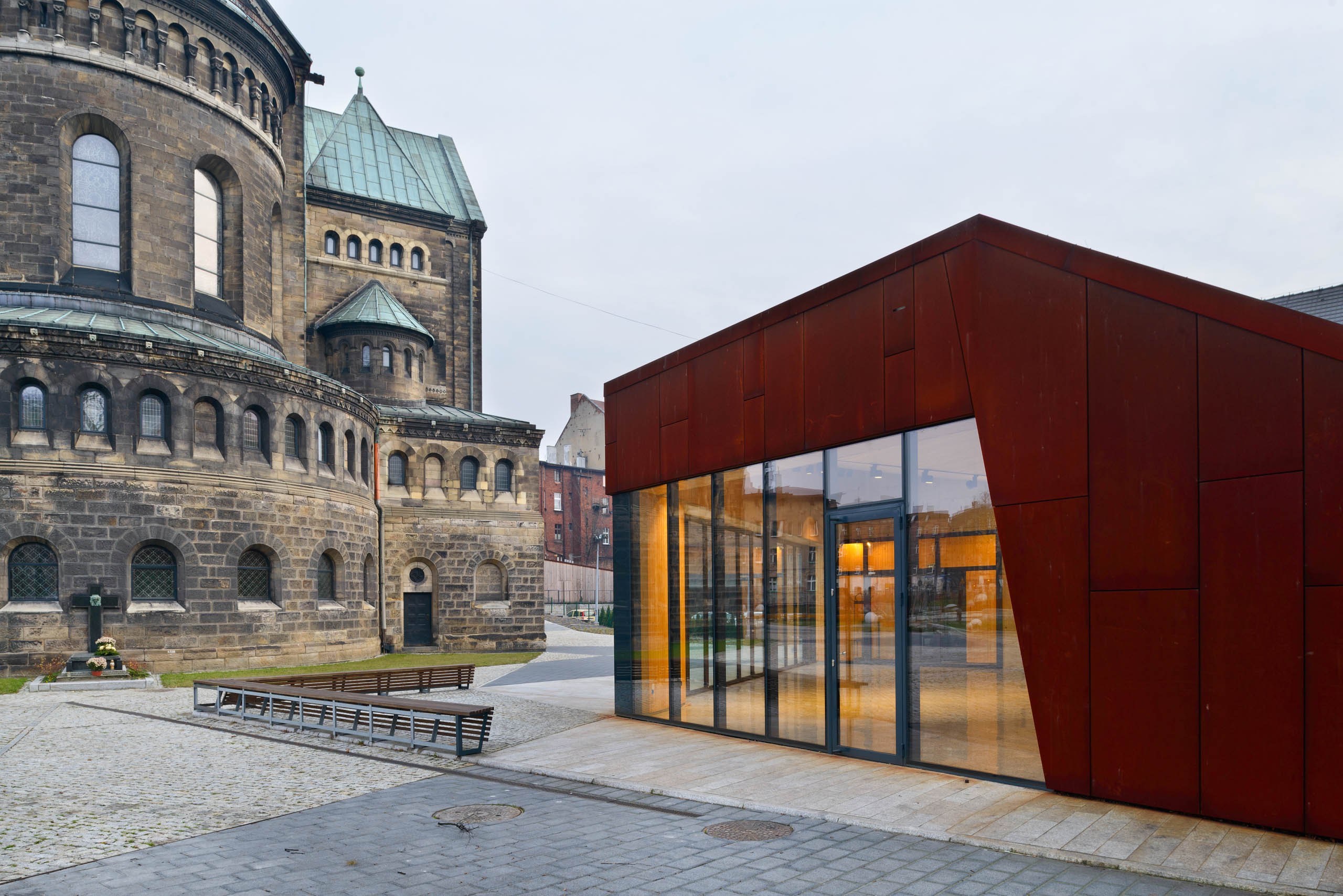 Nowoczesne budynki z wielofunkcyjnymi pomieszczeniami przeznaczone do pracy z młodzieżą, organizacji wystaw i koncertów stały się miejscem wypoczynku i rekreacji, skupiającym aktywność mieszkańców dzielnicy. Projektowane obiekty pełnią funkcję świetlic religijnych, miejsca wystaw i występów dla małych form teatralno-muzycznych. Oba budynki wpisano w układ kompozycyjny nowego zagospodarowania terenu. Dzięki współczesnej stylistyce kontrastują z zabytkowym gmachem neoromańskiego kościoła św. Jacka., jednocześnie – formą i skalą – utrzymają historyczną hierarchię podkreślając rangę świątyni. Dzięki nowoczesnym materiałom takim jak Corten i szkło nawiązują z nią jednak pokoleniowy dialog.