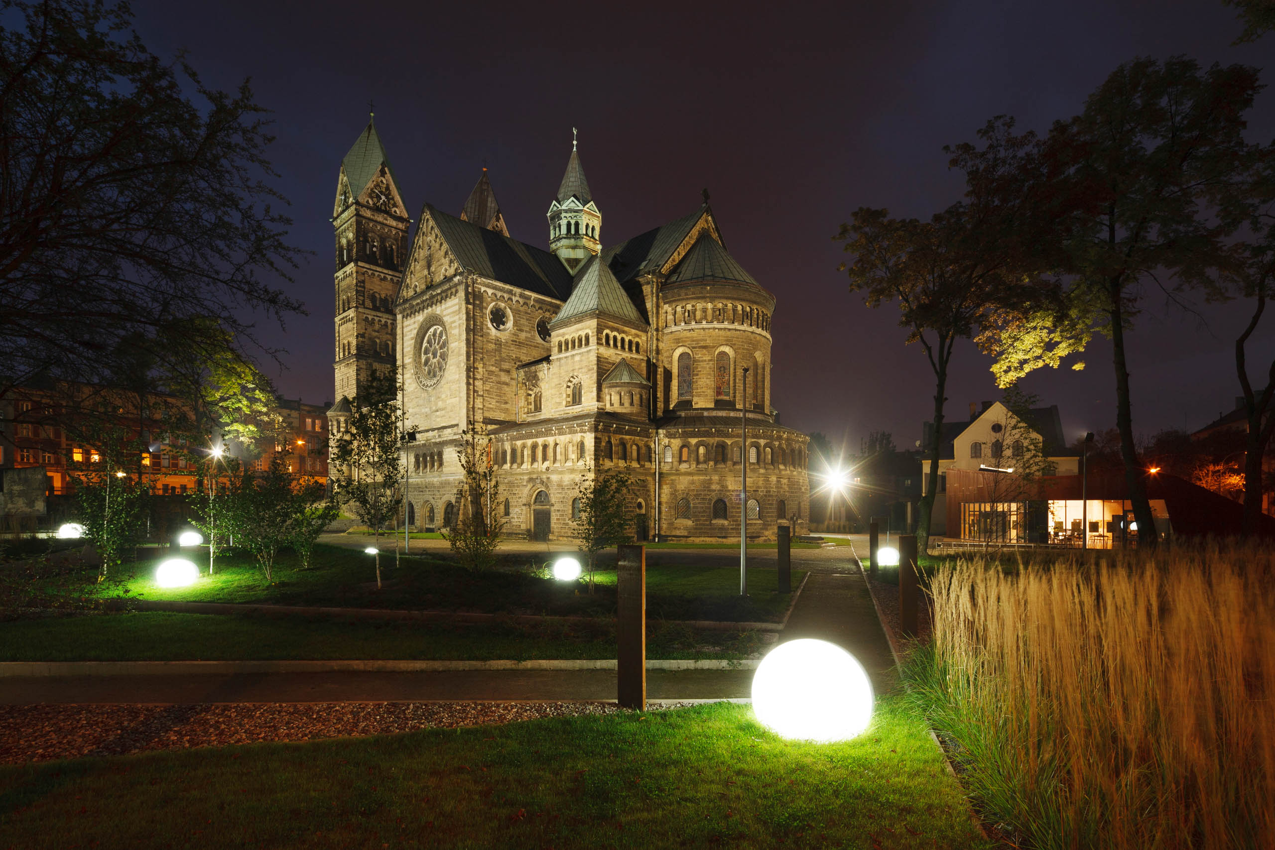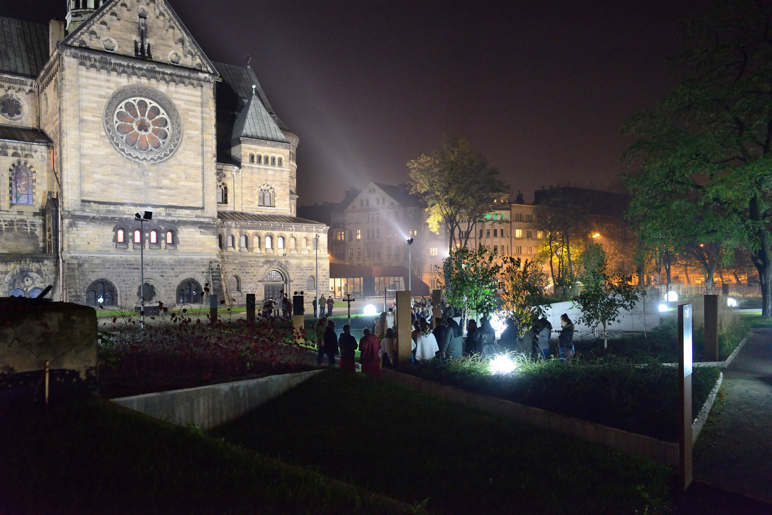 Zaprojektowany przy kościele ogród nawiązuje więc do postaci św. Jacka, patrona miejsca, nauczyciela modlitwy różańcowej. Wzdłuż alejek wprowadzono elementy sakralne w postaci tablic różańcowych i centralnie umieszczonej groty maryjnej z oczkiem wodnym. Całość dopełnia oświetlenie w formie dwudziestu kul, nawiązujących do lokalnej legendy różańcowej. W ten sposób bezimienna przestrzeń zmieniła się w miejsce spotkań o charakterze religijnym stanowiące nowoczesną wizytówkę miasta.