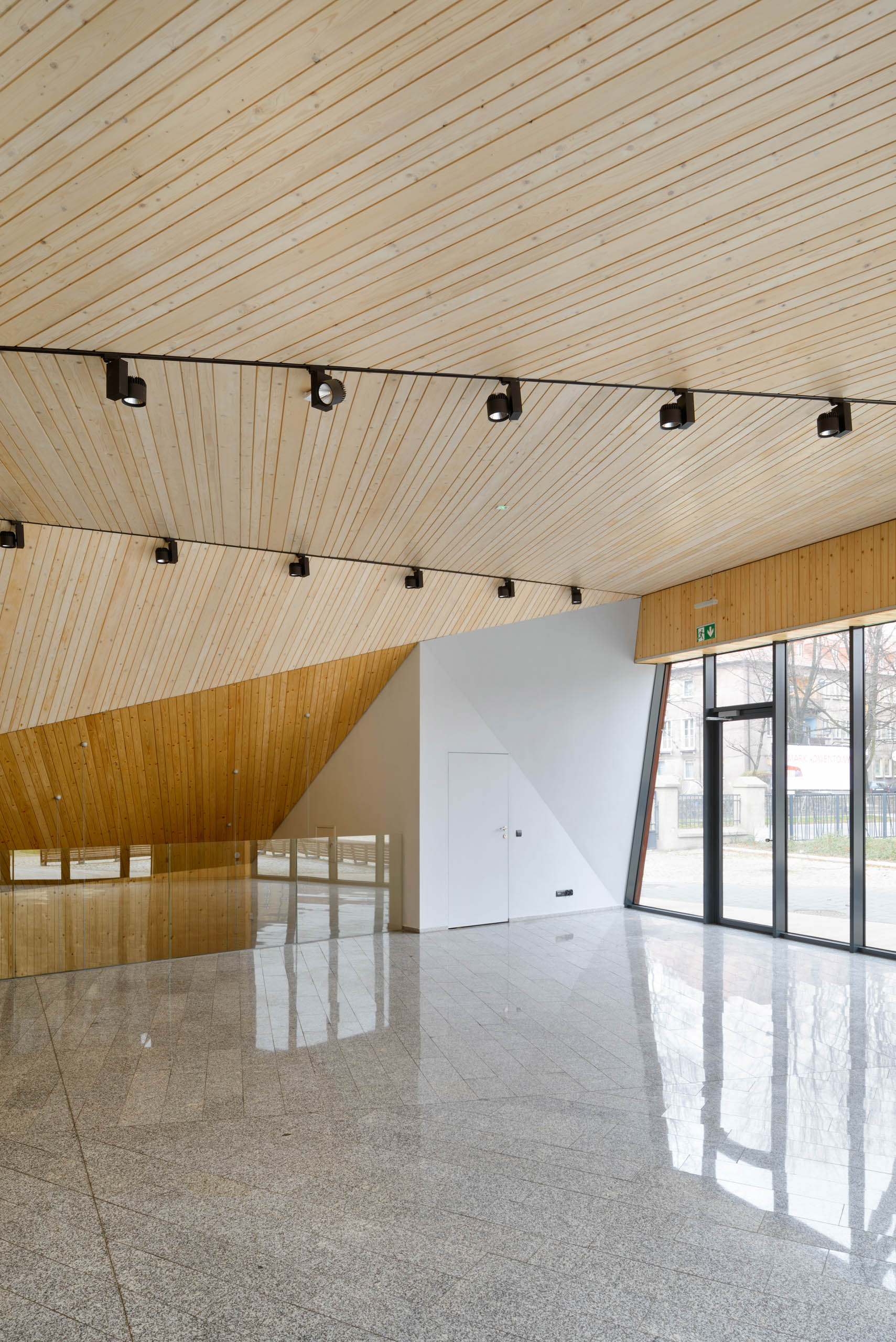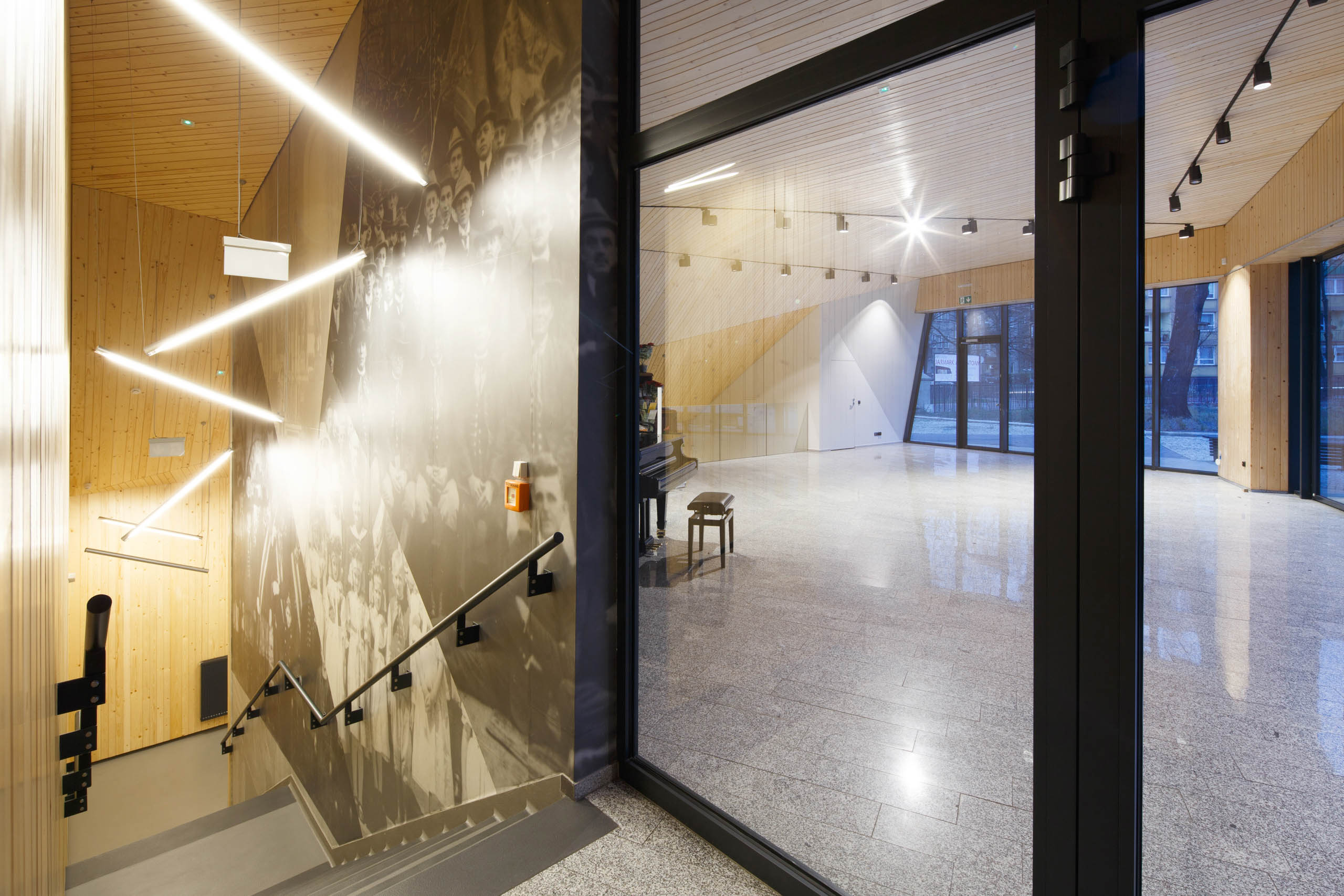 Aby dodatkowo wydzielić tę przestrzeń w narożniku zlokalizowano ławkę, która domyka otoczenie (widownię) przy budynku. Ta mała forma architektoniczna, prowokować ma do zatrzymania i modlitewnej kontemplacji. W samym budynku mieszczą się sale do rozmaitych zajęć oraz wydarzeń teatralnych, muzycznych i wystaw, dlatego wnętrze zaprojektowano operując oszczędnymi środkami, wykorzystując przyjazne materiały, takie jak drewno oraz wielkoformatowe wydruki, obrazujące wydarzenia z historii dzielnicy Rozbark w Bytomiu.
